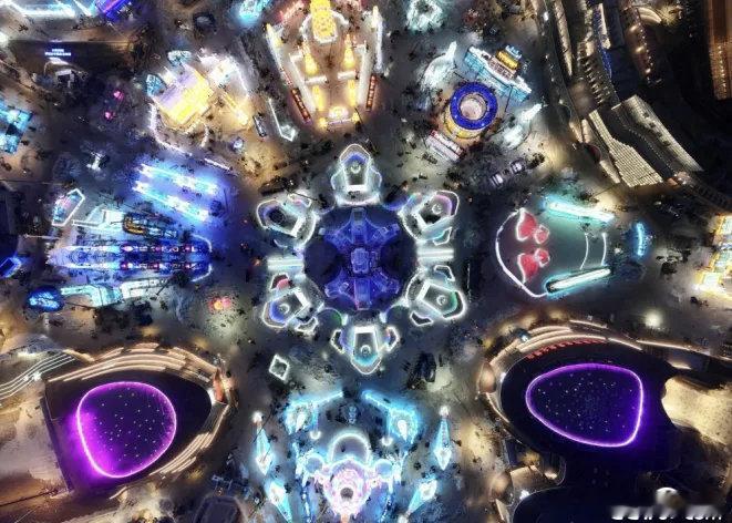 12月12日傍晚,第二十七届哈尔滨冰雪大世界园区多数冰建已近完工,外形轮廓清晰呈现,晶莹剔透的冰雕在灯光映衬下熠熠生辉。(来源 : CCTⅤ央视网)