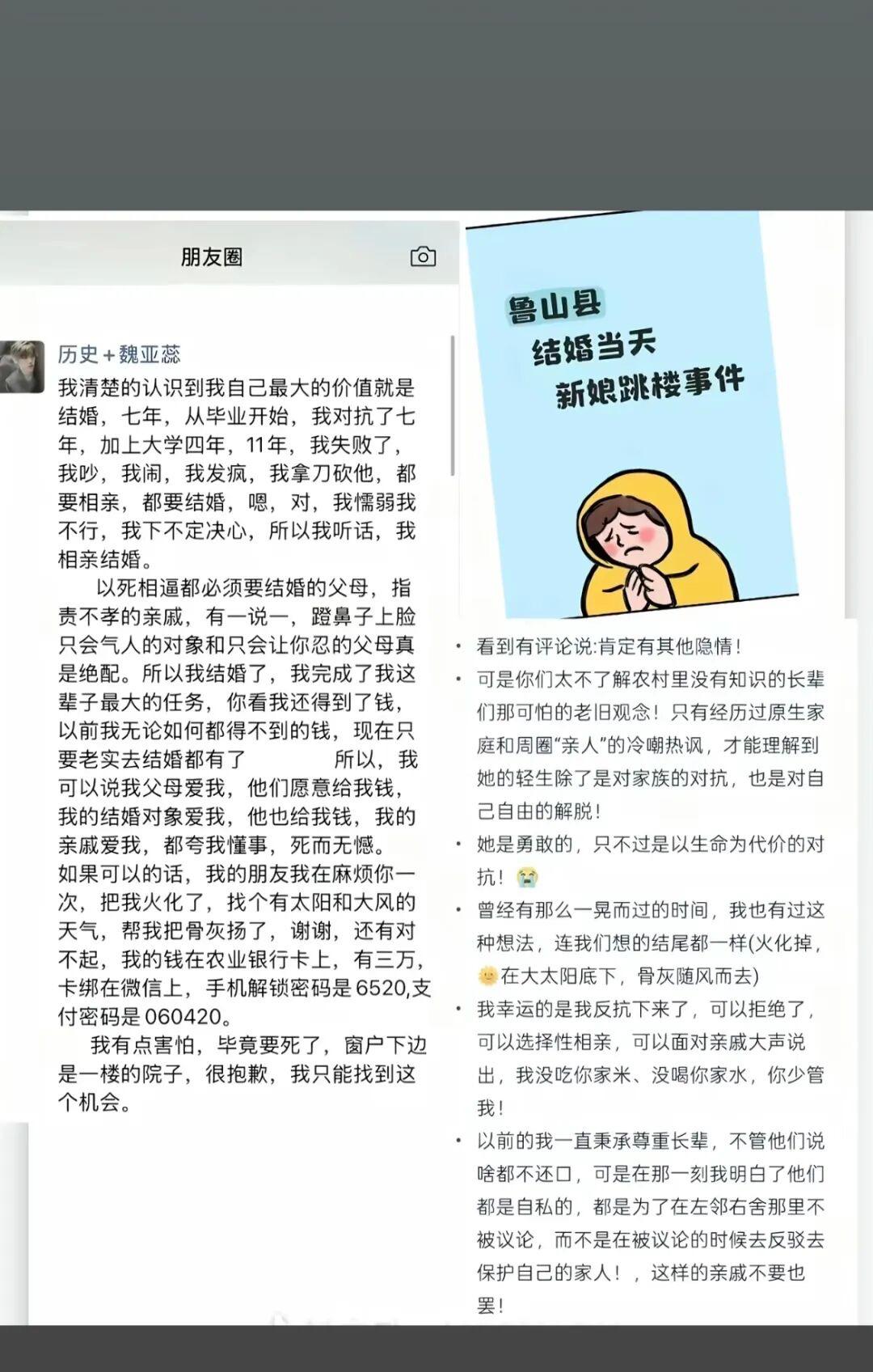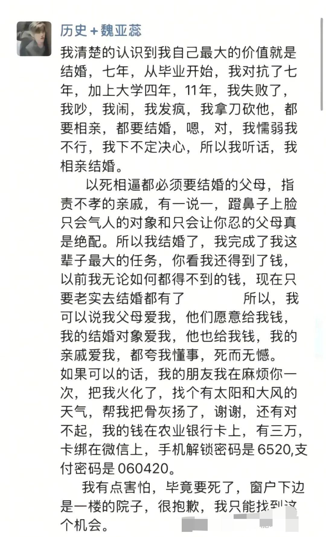 这个是河南鲁山历史女教师魏佳蕊的照片吗?听到这个噩耗太可惜了,才28岁的年华,一个受学生欢迎的漂亮老师,有着独立的人格和个性,想必这样的老师讲课一定是神采飞扬,眼里放光的。只是她的父母和亲戚们看不到,他们眼里只有你是个大龄剩女,再不结婚就嫁不出去了,就成老姑娘,是被人说闲话的对象。为什么读完大学的女孩要去大城市,因为可以逃脱世俗的牢笼,活得自由洒脱。女历史老师