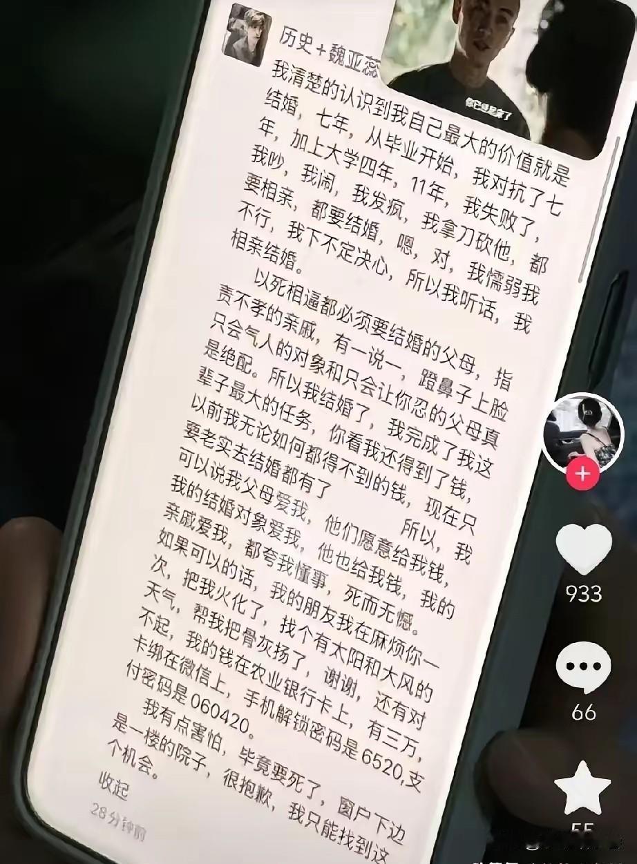 看到女孩的遗书,看得出来她挣扎过,但没有用,才选择了这么极端的做法。 从内容上来看,女孩是一位比较优秀的老师,只是她面对的现实,是一个带有封建思想的家庭。 这场悲剧,值得我们深思。为什么在如今的社会中,还能有这样的事情发生呢? 这个故事不是个例,只是像这个女孩一样,与命运抗争的不多,很多女孩遇到这种情况都选择了默默接受……。 她的离去,是那么决绝,没有半点犹豫,也许她累了……!学生遗书 女孩遗书 生前遗书 九旬母亲的遗书 死前遗书 未完成的遗书 临终遗书 学生遗书 女孩遗书 生前遗书 九旬母亲的遗书 死前遗书 未完成的遗书 临终遗书 青春遗书