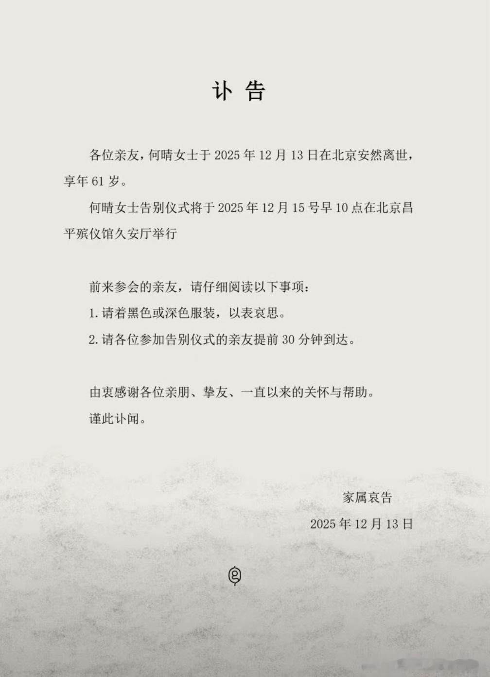 【著名女演员何晴去世,享年61岁!她曾演遍四大名著影视作品】12月13日,著名演员何晴家属发布讣告显示,何晴在北京安然离世,享年61岁。告别仪式将于2025年12月15日早10点在北京昌平殡仪馆久安厅举行。★演员何晴★何晴家属发布讣告何晴1964年1月13日出生于浙江衢州江山市,毕业于浙江昆剧团,1983年凭借《少林俗家弟子》正式踏入演艺道路。她是中国内地唯一一位演遍四大名著影视作品的女演员,被誉为“古典第一美女”。1984年,她在《西游记》中饰演文殊菩萨化身的怜怜;1988年,在电影《红楼梦》里塑造了多情不幸的秦可卿;1993年,《三国演义》中温婉美艳的小乔成为其经典形象;1996年,她又在《水浒传》中演绎出李师师的端庄典雅。★演员何晴演遍四大名著除四大名著外,何晴还有很多家喻户晓的作品。1992年,她作为内地首批“瑶女郎”出演《青青河边草》的华又琳,塑造出独立知性的新时代女性形象;1998年在《澳门的故事》中突破古典戏路,饰演泼辣豪爽的中葡混血儿欧迪丝;2011年,她在《大宅门1912》中接棒饰演杨九红,与陈宝国搭档演绎乱世爱情;2016年,她在《女医明妃传》中首次挑战反派,将孙太后的狠绝与温婉演绎得淋漓尽致。从昆曲舞台到影视荧幕,何晴以扎实的演技和独特的古典气质,塑造了数十个鲜活的角色。她的表演真切朴实,亦古亦今的塑造能力,让众多形象成为观众心中难以复刻的经典。(来源:北京日报客户端)