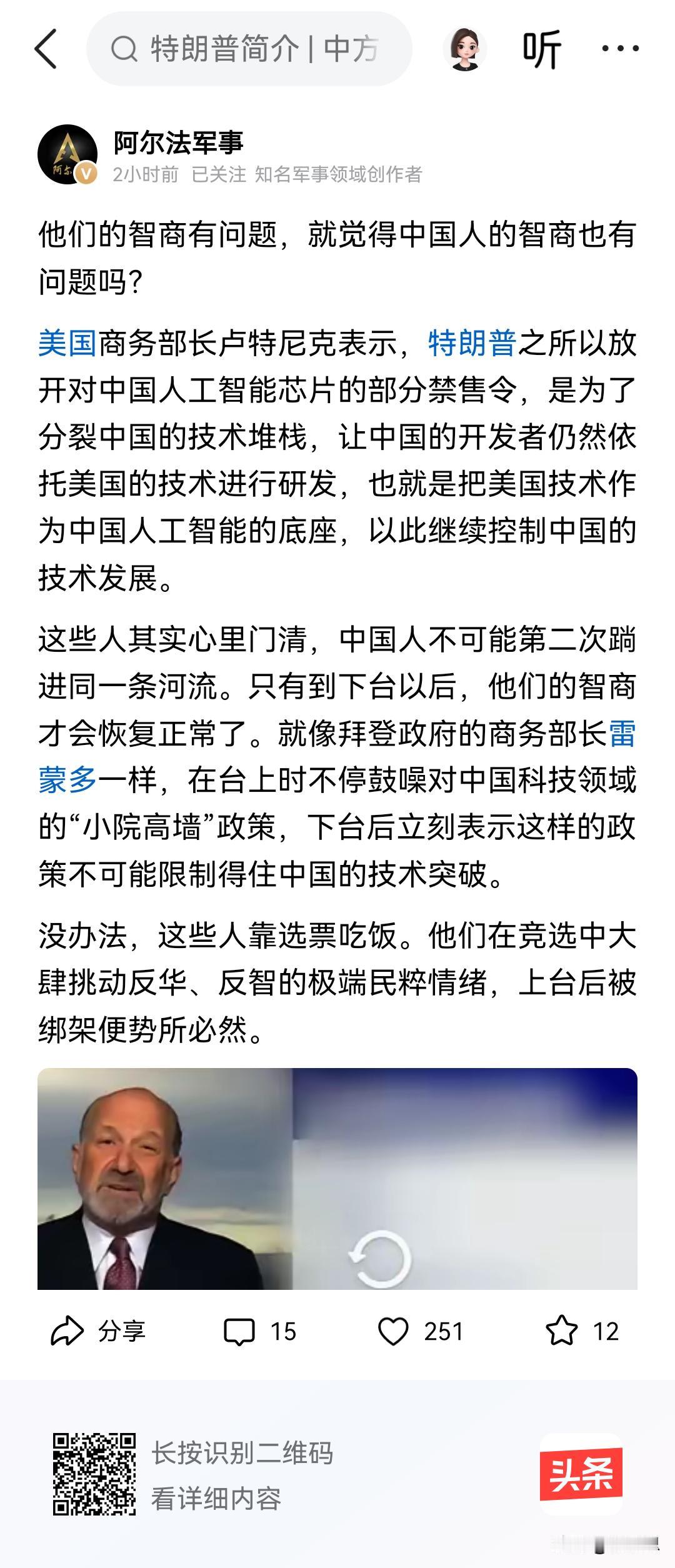 美国的部长们都是大聪明是吧?在他们眼中,中国人都是低智商的人吗?他们竟然说要中国继续用美国的芯片技术底盘,这样可以分裂中国的技术,可以控制中国的技术,中国之前就受到了这种的制约,现在中国已经焕然醒悟了,难道自己的技术都起来了还要自废为功,再拥抱所谓美国的技术吗?他们是不是太聪明,把我们想太傻了。