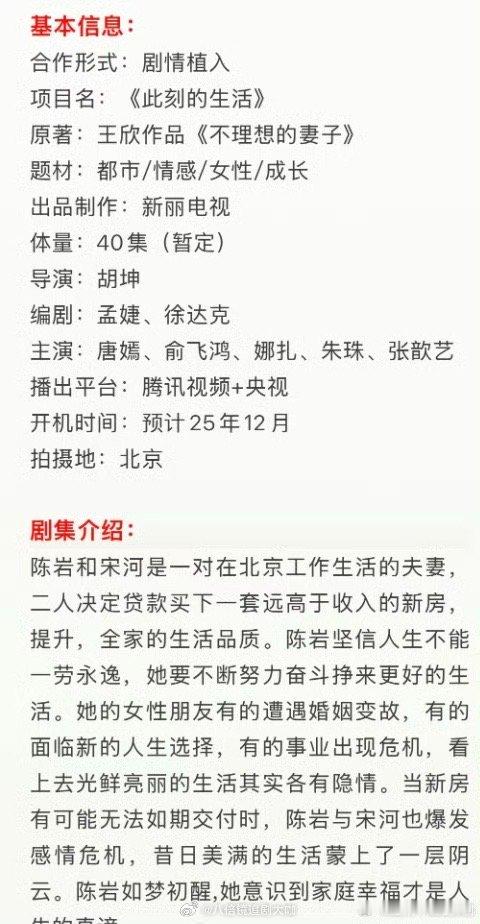 唐嫣此刻的生活开始招商哇塞,唐嫣终于要进组拍戏了啊。电视剧《此刻的生活》开始招商,唐嫣这部剧的阵容绝了吧,俞飞鸿、朱珠、古力娜扎,全员大美女,谁看了不心动啊,坐等剧组官宣阵容啦~唐嫣此刻的生活制作班底