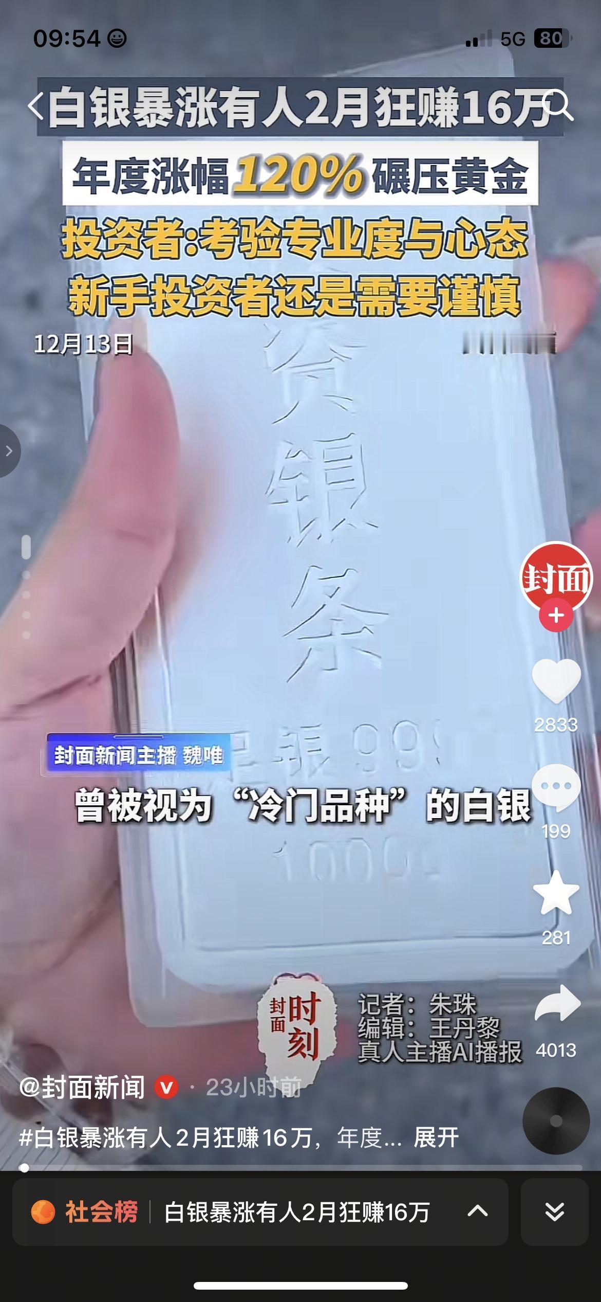 注意!白银涨120%有人2月赚16万,咱理财新手别跟风 最近瞅着白银价格一路飘涨,不少人晒出盈利截图,有人俩月就赚了16万,说实话看着真让人动心。权威渠道明确说,今年白银涨幅已经超120%,比黄金涨得还猛。但咱普通人得清楚,这行情波动特别大,新手盲目跟风容易亏本金。其实很简单,真想尝试就小额试水,先观察半个月行情再动手,别重仓投入免得踩坑。我身边朋友之前追高亏过,新手真得稳着点来。你对白银投资感兴趣不?评论区唠唠白银价格疯涨