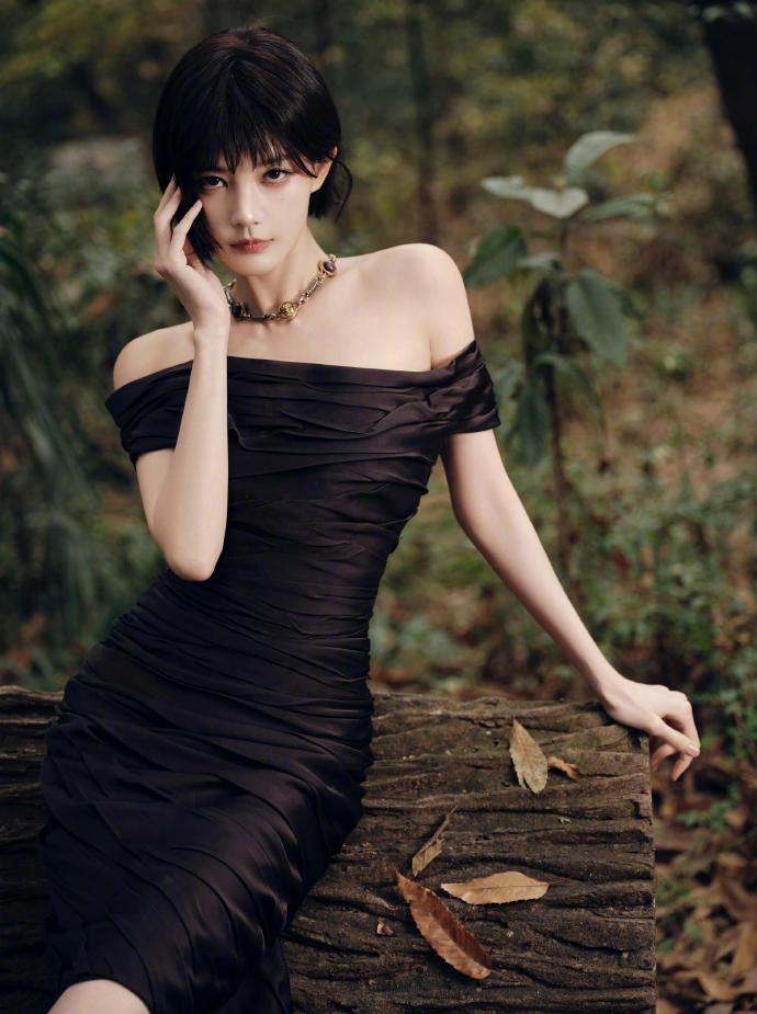 李一桐成都范思哲大片,上身深棕一字肩褶皱裙装,搭配金属链条颈饰,裙身缎面肌理设计衬出柔婉线条,林间落叶和短发清冷感呼应,完全千金感
