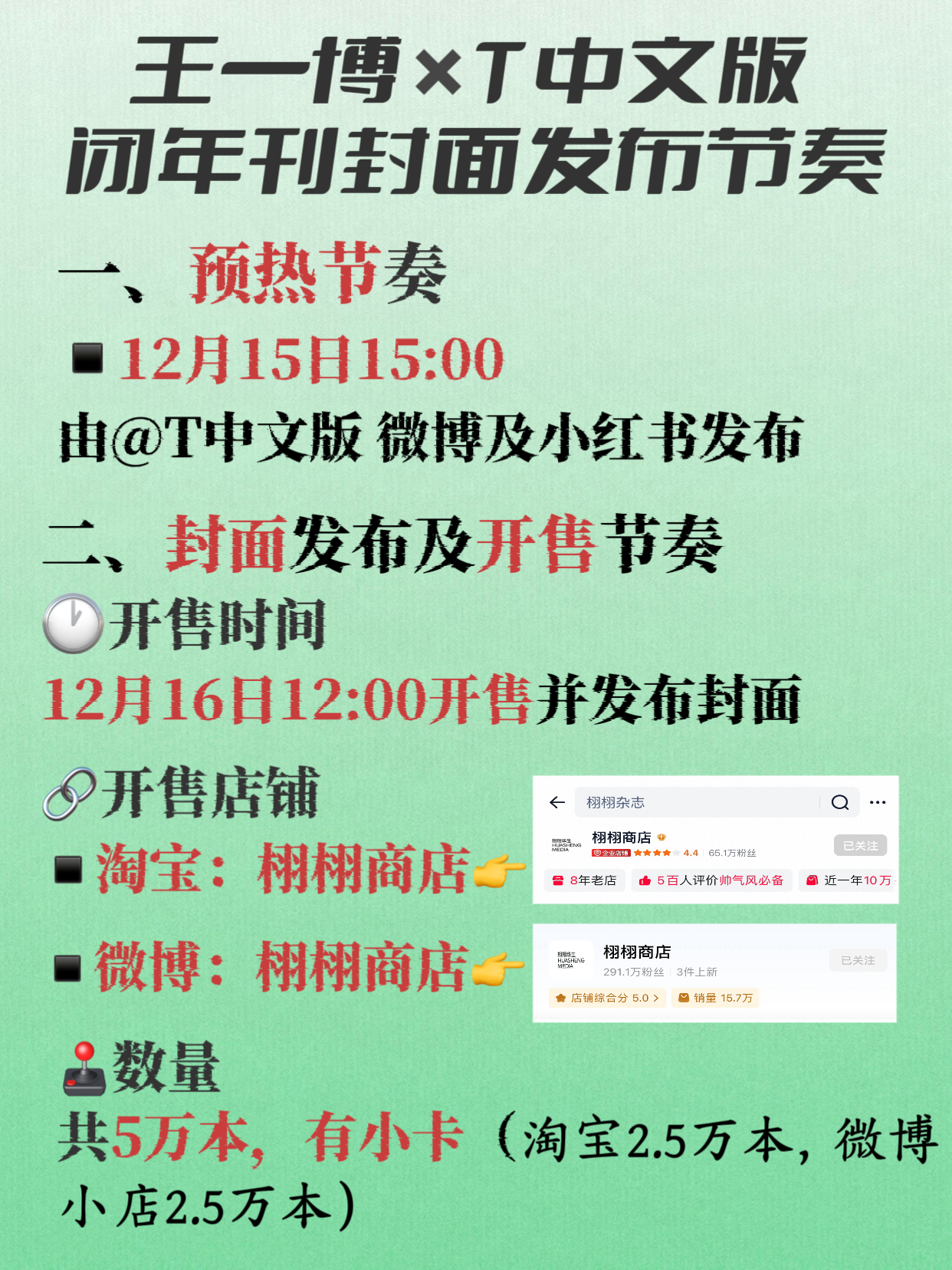 【王一博✖️ 闭年刊发布节奏】宣传时间有限,所有人见扩起来,预热时做好互动,开售即秒切❗️,给各个平台粉丝宣传好时间和店铺,每个人都不要错过!▪️预热节奏12月15日15:00▪️开售及封面发布节奏🕐开售时间12月16日12:00🛒开售店铺淘宝:栩栩商店👉网页链接 微博:栩栩商店👉栩栩商店💕数量共5万本,有小卡,淘宝2.5万本,微博2.5万本!目前店铺和数量是按照之前经验整理,请大家做好准备,开抢在即,多多扩散,秒切两个字刻进每个人心里,这次我不要看见都卖完了问在哪买王一博