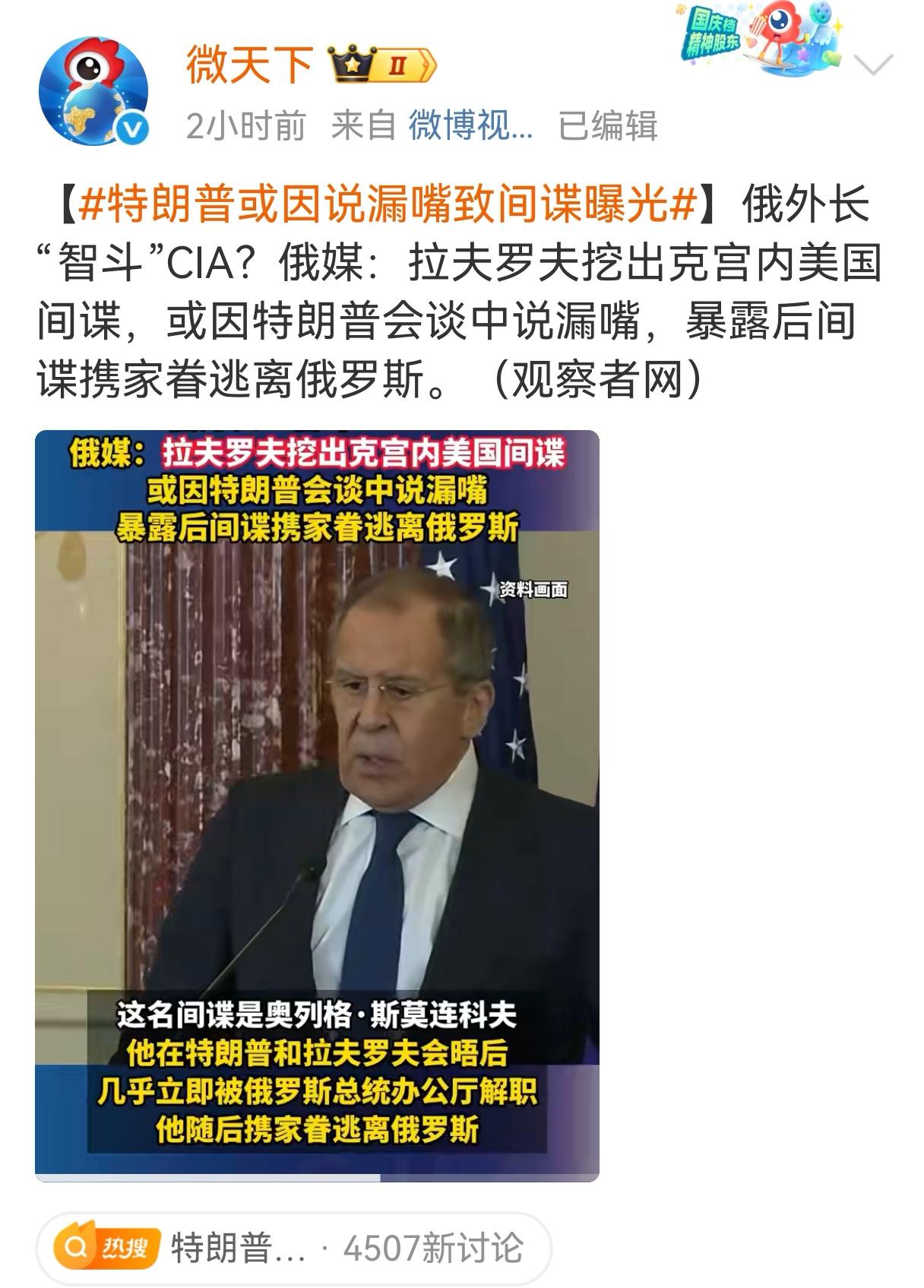 克宫间谍案的新闻报道的标题用了问号,而不是句号、感叹号,所以今天的故事只能用据说来表达。俄外长拉夫罗夫“智斗”CIA?据俄媒报道:拉夫罗夫挖出克宫内美国间谍,或因特朗普会谈中说漏嘴,暴露后间谍携家眷逃离俄罗斯。 可能因为特朗普总统每天24小时持续不断对外广播,所以他给人造成了一种错觉,认为他大嘴巴,藏不住事,容易泄露机密。但这只是一种错觉,他精着呢!如果他真的藏不住事,怎么可能二度入主,真的民主党都是干饭的。 特朗普总统只是有的放矢地专门说漏嘴而已,只是对方给的筹码足够。这事儿发生在2017年,故事的主角是奥列格·斯莫连科夫,时任俄总统办公厅官员,可接触俄罗斯的核心信息,被CNN称为美方在俄权力机构中“最有价值特工之一。这么有价值的特工牺牲了,足以说明特朗普得到的筹码很大。