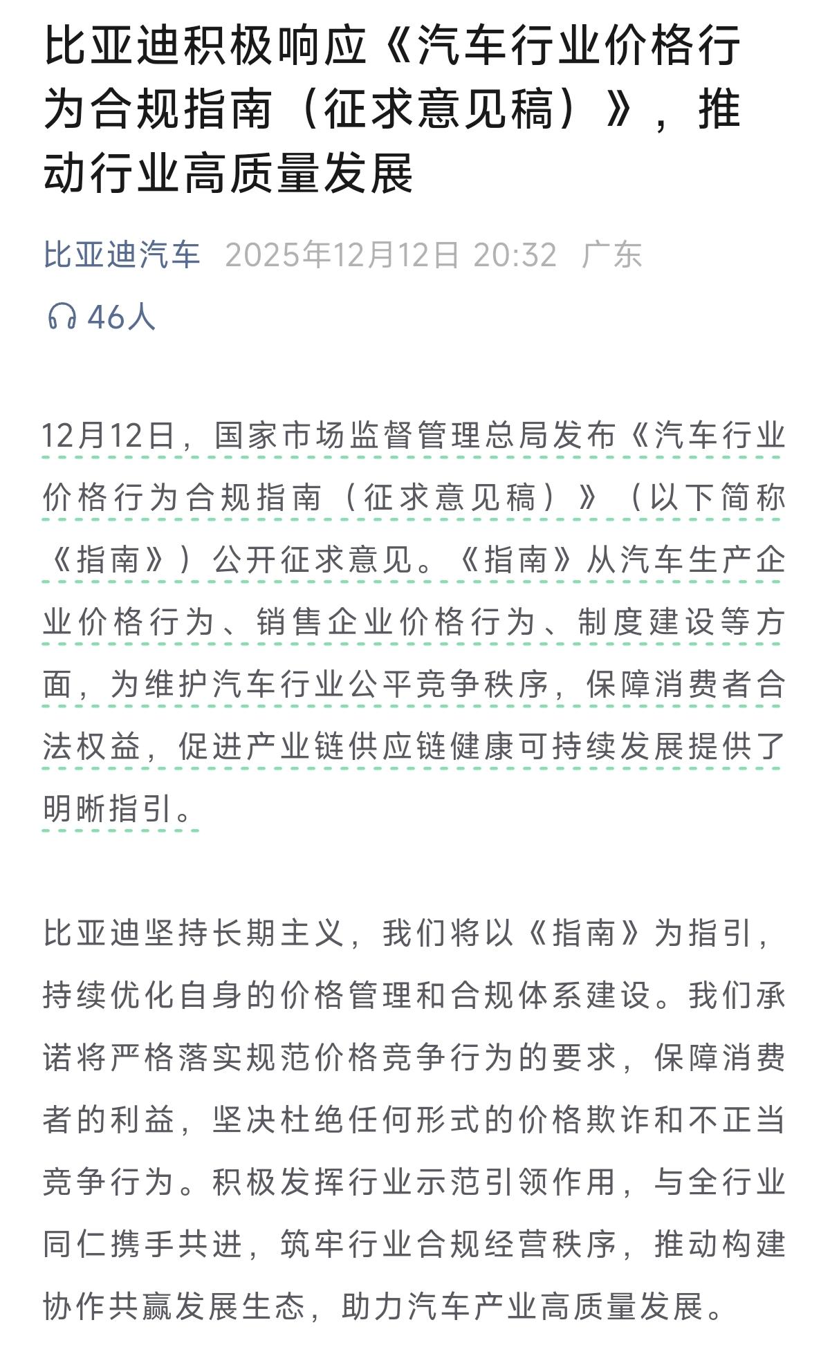 国家终于出手管理车企“亏本卖车”的不良市场行为了!国家市场监督管理总局近日发布了《汽车行业价格行为合规指南(征求意见稿)》,从汽车生产企业价格行为、销售企业价格行为、制度建设等多方面对汽车的价格进行监督和规范,在保障消费者的合法权益的同时,也促进了国内汽车行业公平竞争发展,还对汽车产业链的健康可持续发展起了重要作用! 所以,比亚迪率先响应,第一时间发文支持并积极参与。比亚迪的态度,与之前友商攻击比亚迪“亏本卖车”完全不一样。比亚迪之所以能把B级车干到A级车的价格、A级车干到6-7万,主要是得益于它早期全产业链的布局,现在比亚迪汽车的核心零部件全部都是自己研发的,仅仅3%左右靠国内供应商供应。 对于比亚迪这么凶悍的发展,老美也计划把比亚迪、阿里巴巴、百度等多家中中国企业列入“中国涉军企业名单”!所以,大家不要怀疑比亚迪在新能源汽车核心技术领域的权威性,能够被列入这份名单就是老美对比亚迪在新能源汽车核心技术的“认可”!大家知道国内有哪一家车企能被列入这份名单吗?