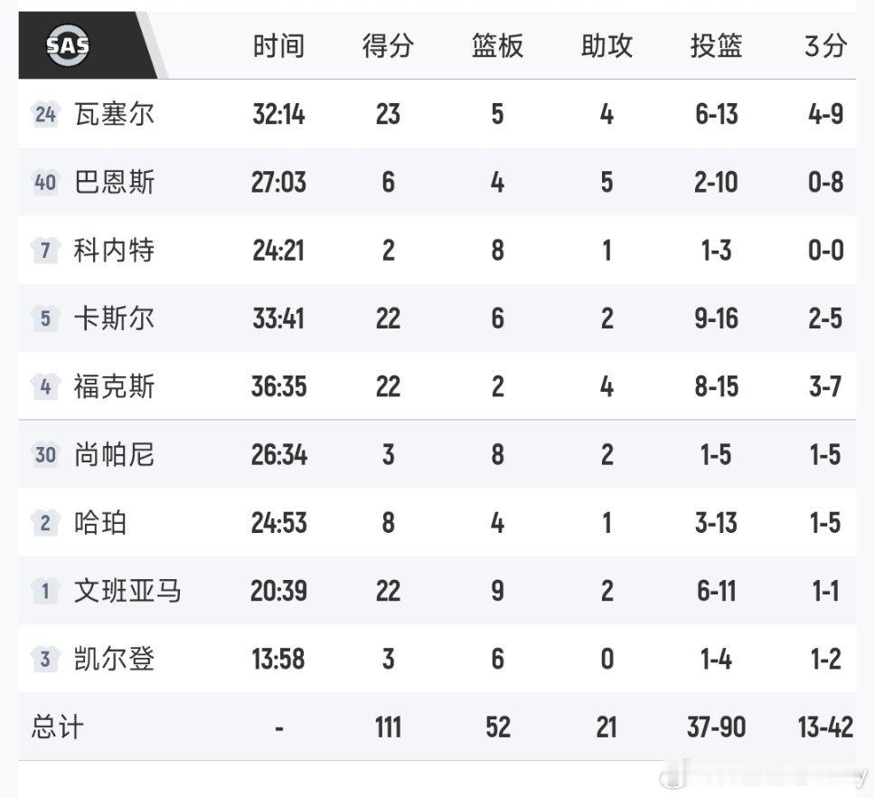 马刺的战力,4人20+,似乎每个位置都很突出,状元榜眼只能打替补。马刺终结雷霆1