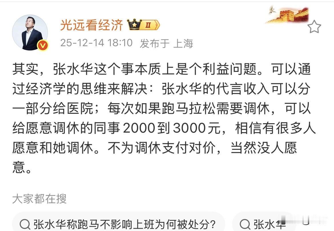 经济学家马光远给张水华支招:给医院分成,给同事分钱! 今天晚上,经济学家马光远,他认为张水华这个事情,其实从根本来讲就是一个利益的问题,所以在他看来要解决这个问题,其实很简单,只需要用两条就OK了: 首先是要舍得分大钱,他现在已经代言了国内某某知名的运动品牌,相应的报酬也是好几十万,根据目前能够看到的信息,这部分钱她是没有分出来的,也就是说这种大钱,她是没有舍得拿出来分的。 因此,马光远认为,这可能是她与自己的单位产生矛盾的一个重要的原因之一,毕竟她的身份还是单位上的人,虽然这个是她自己,也确实是通过自己的能力去挣的这个钱,但如果就这样一分钱不给医院分的话,总觉得哪里说不过去。 另外一个关键的就是要与医院的同事关系处好,虽然她调休是医院组织上批准,但本质上来说耽搁的确实各个同事,麻烦的也是日常相处的兄弟姐妹们,这个时候她就真的应该拿出一点钱来,或者稍微大气一点,就像马光远说的,调一次班拿个几千块钱,其实好多问题就迎刃而解了。 当然,这几天白岩松也在,这意思就是她可以加入他们医院的工会,带着大家一起跑[捂脸],或者实在不行就弄成专职的。 目前来看,能够有效果的还是马光远的这个招数,大家平时上班的时候就有这种感觉,如果你对同事慷慨一点大气一点,拿个几千块钱让他们把这个事情做好,估计没几个不愿意。 只是目前不知道张水华她本人,到底是怎样想的。