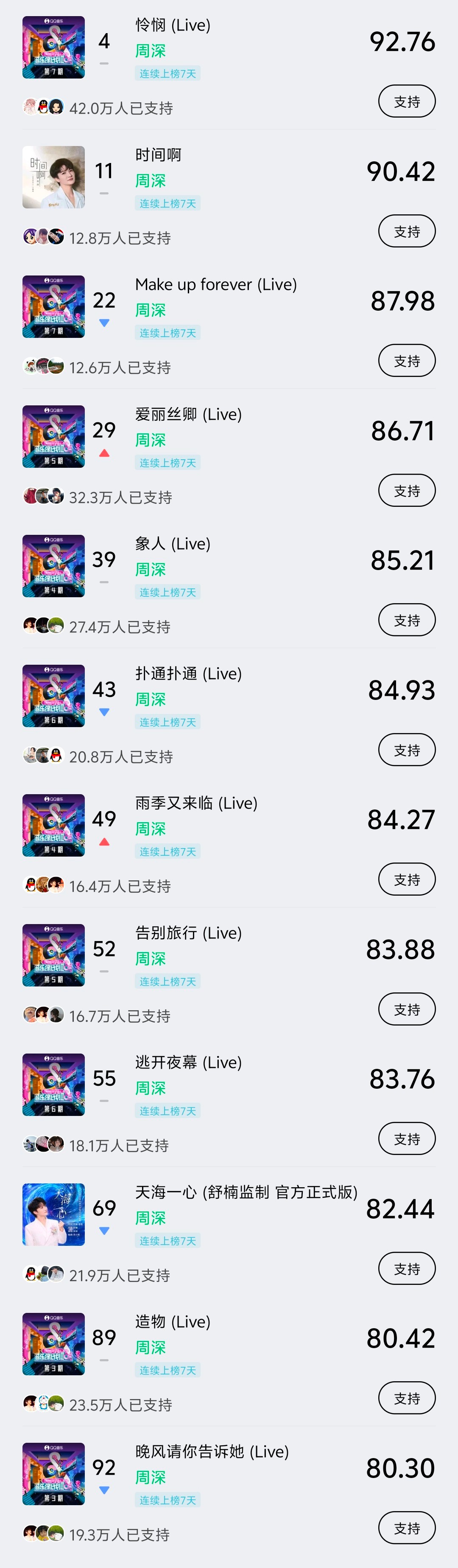 周深📣 12.14 巅峰潮流 📣米米们晚上好每歌做6个动作路径:Q音-乐馆-排行-潮流巅峰✅《怜悯(live)》✅《时间啊》✅《Make up forever(live)》✅《爱丽丝卿(live)》✅《象人》✅《扑通扑通(live)》✅《雨季又来临(live)》✅《告别旅行(live)》✅《逃开夜幕(live)》✅《天海一心(live)》✅《造物(live)》✅《晚风请你告诉她(live)》✅《时差(live)》完成『支持』让更多人听到深深