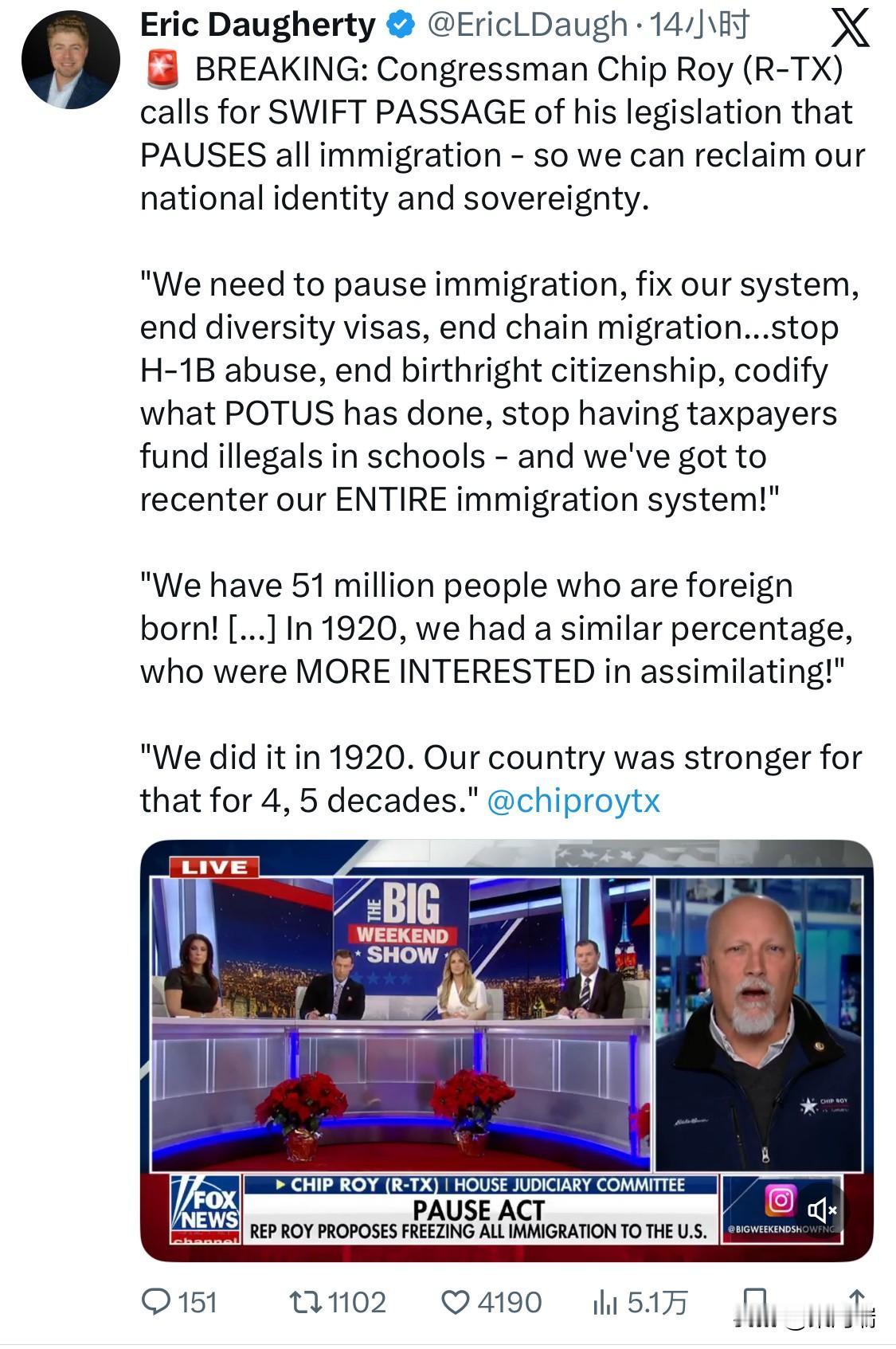突发新闻:美国国会共和党议员奇普·罗伊( R-TX)呼吁迅速通过他的法案,暂停所有移民——以便我们能够重拾我们的国家认同和主权。 “我们需要暂停移民,改革我们的制度,终止多元化签证,终止连锁移民……停止滥用H-1B签证,终止出生公民权,将总统的举措写入法律,停止让纳税人资助非法移民上学——我们必须重新调整整个移民制度!”
