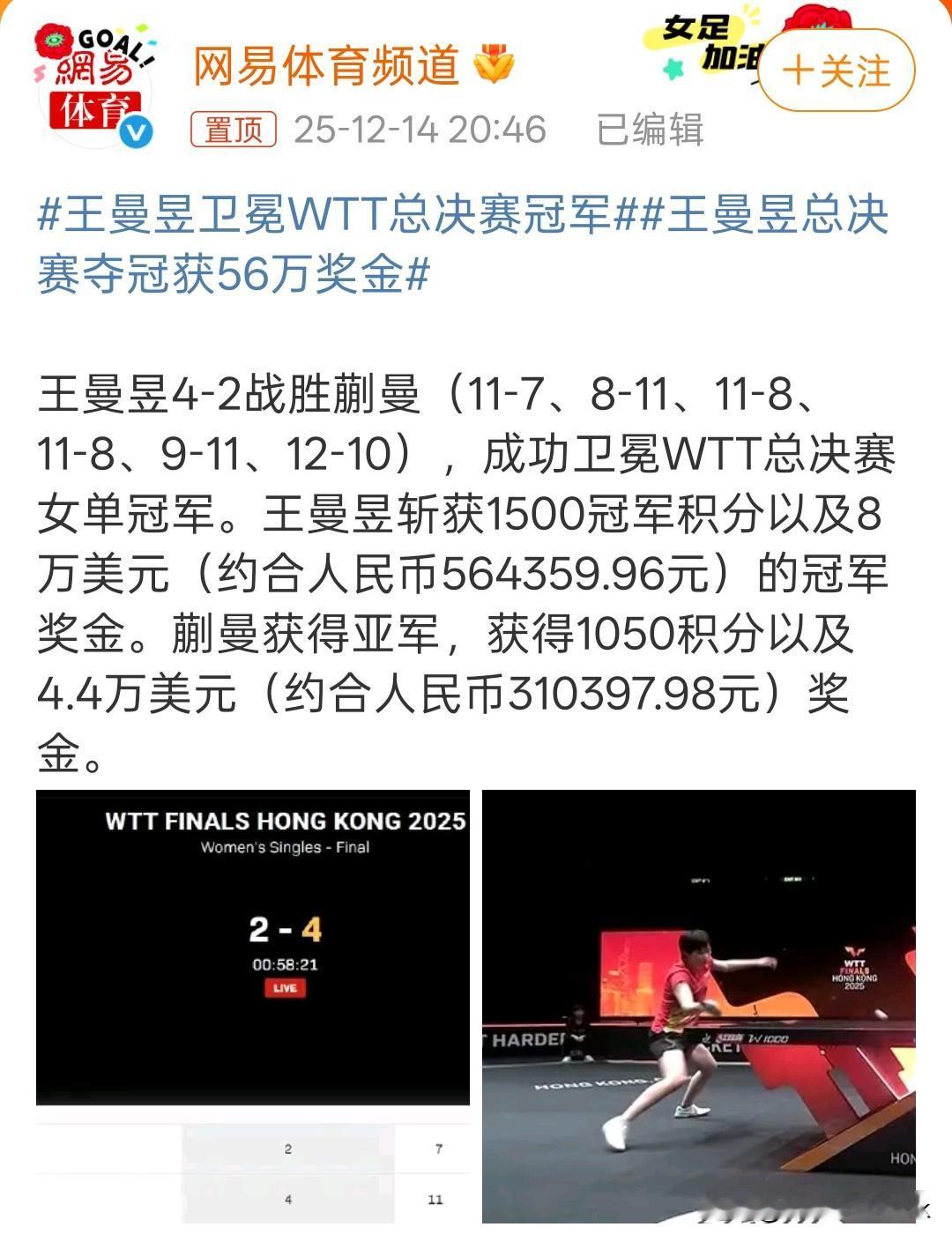 恭喜王曼昱成功卫冕女单冠军,赢得1500积分和56万奖金[赞] 昨天莎莎退赛之后,蒯曼直接晋级,今天还是不敌王曼昱,但是今天打得挺好的,得亚军也是不错的 蒯曼的亚军为她赢得了1050积分 以及31万元的奖金[赞] 如果昨天莎莎身体没问题,今天和王曼昱争冠军的就是莎莎了,那比赛就会老激烈了