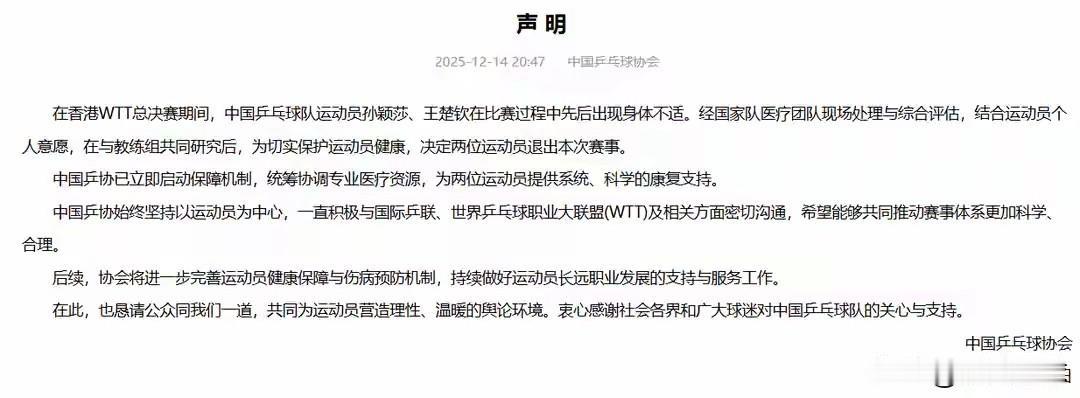 乒协郑重发文:阐述莎头退赛背后 2 个考虑!首先是国家队队医根据运动员的不适,所进行的评估。 其次,是结合各运动员个人想法意愿。 所以不是谁要求谁,而是综合考虑决定,一切都以运动员健康为考虑出发点。 乒协这次发文很及时,避免各种猜测,理应点赞👍