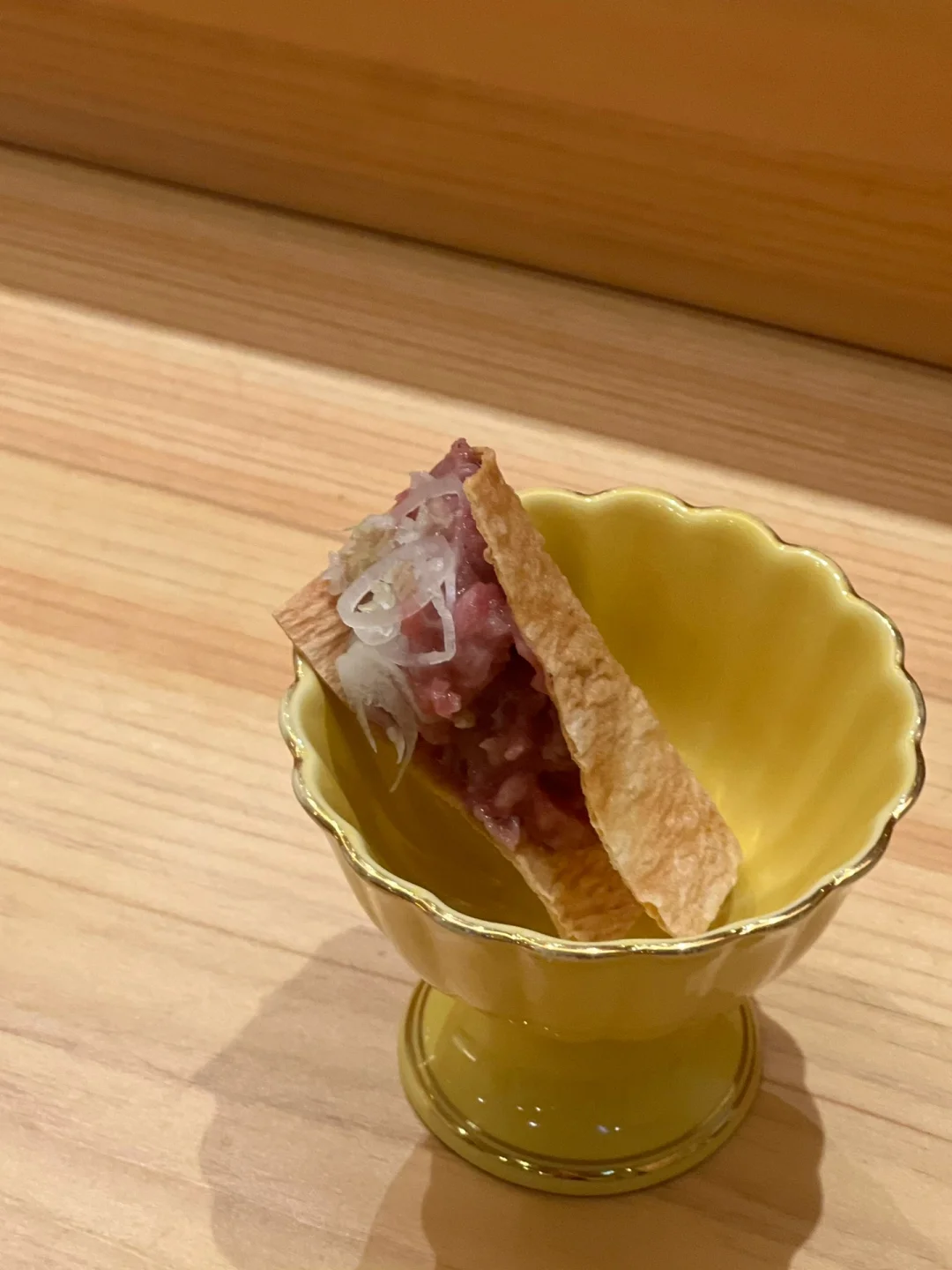 以前只知道熟成的牛排 没想到鱼也可以熟成 一贯追求吃新鲜的生鱼片 第一次尝试吃熟成寿司Omakase 在特定环境下放置一段时间的鱼肉可达到鲜味倍增的效果 - 熟成鲔鱼卷脆脆的很好吃 海胆爱好者最喜欢的还是北海道白海膽搭配虎河豚白子那道 最后的鱼汤煮的面也不错 - 🍣店名:YU-EN结縁 ⏰时间:19:00-22:00 💰价格:2300HKD+10%服务费/人 📍地点:香港西环西营盘西边街38号明德山地下B铺 -