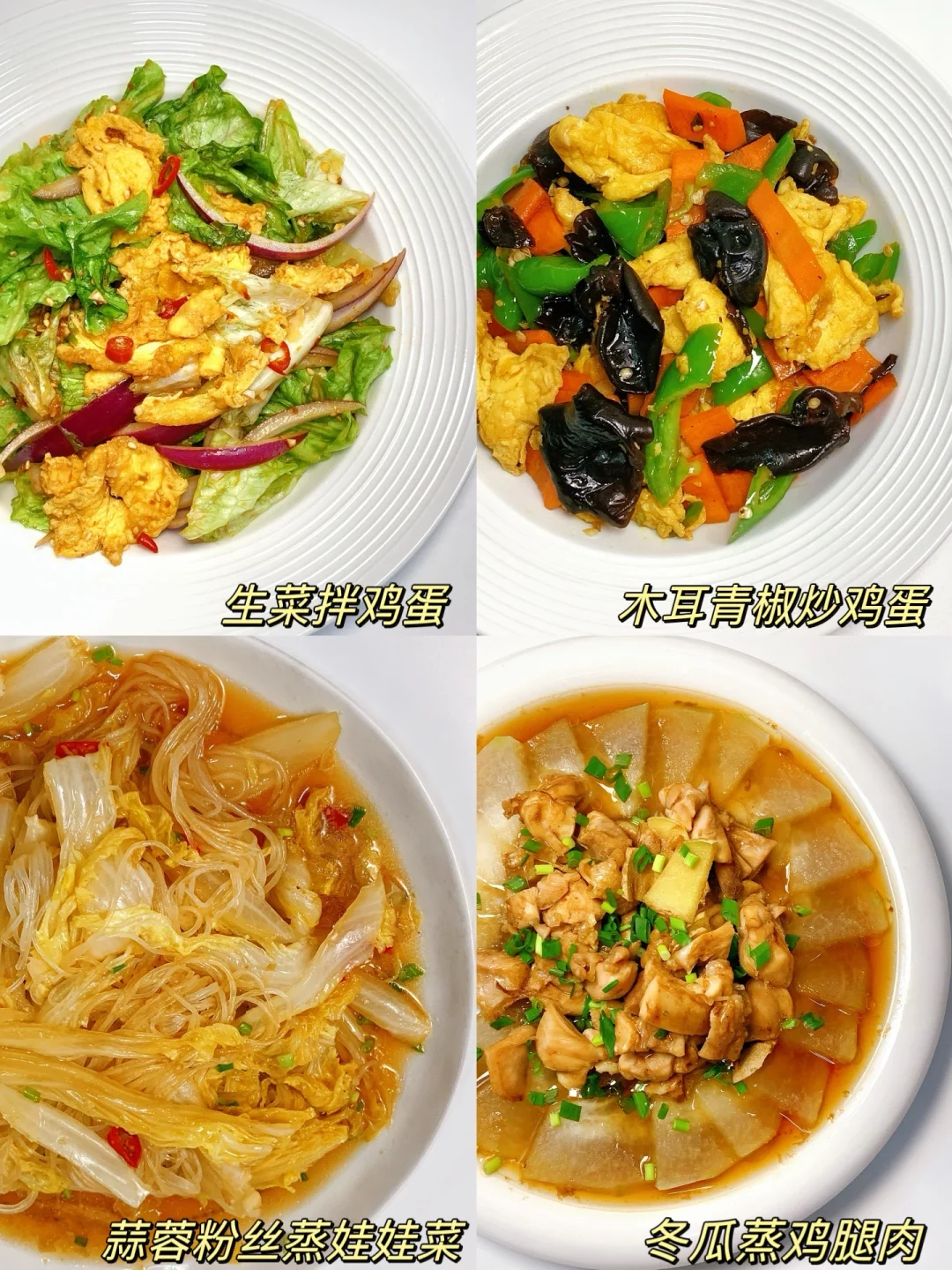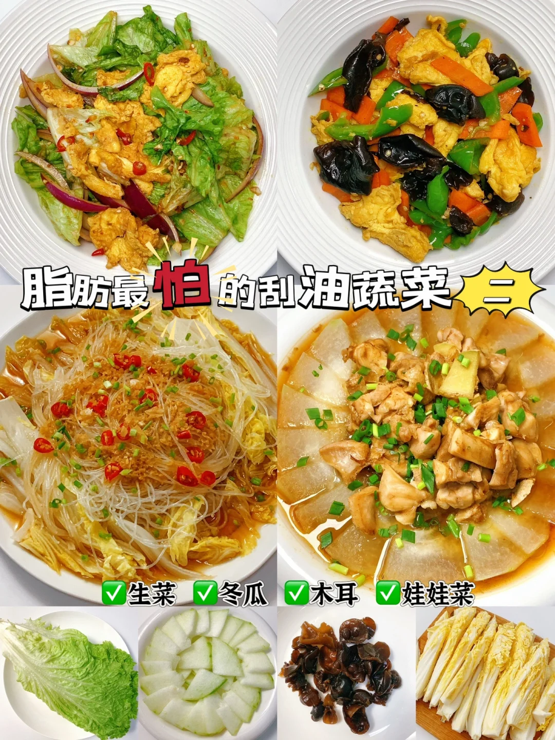 ✨✨今日分享越吃越瘦的刷油蔬菜,祝你减肥成功,满满的膳食纤维,维生素和矿物质~ 🌿可以增加饱腹感 🌿营养价值高 ♨️今日分享蔬菜 ✅冬瓜~冬瓜蒸鸡腿肉,100g /10千卡 ✅木耳~木耳青椒炒鸡蛋,100g/27千卡 ✅生菜~生菜拌鸡蛋,100g/12千卡 ✅娃娃菜~蒜蓉粉丝蒸娃娃菜,100g/13千卡 [向右R]做法见图片(图[四R][六R][八R][九R][一R][一R], 🕑时间:10-15分钟 ⭐难度:零厨艺✌️