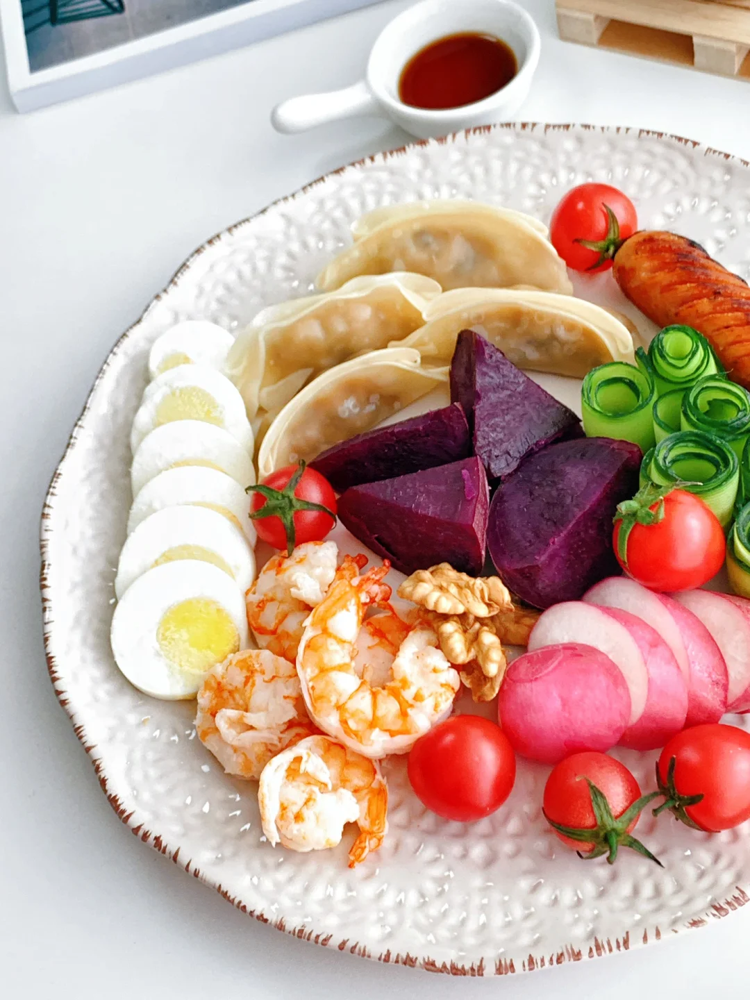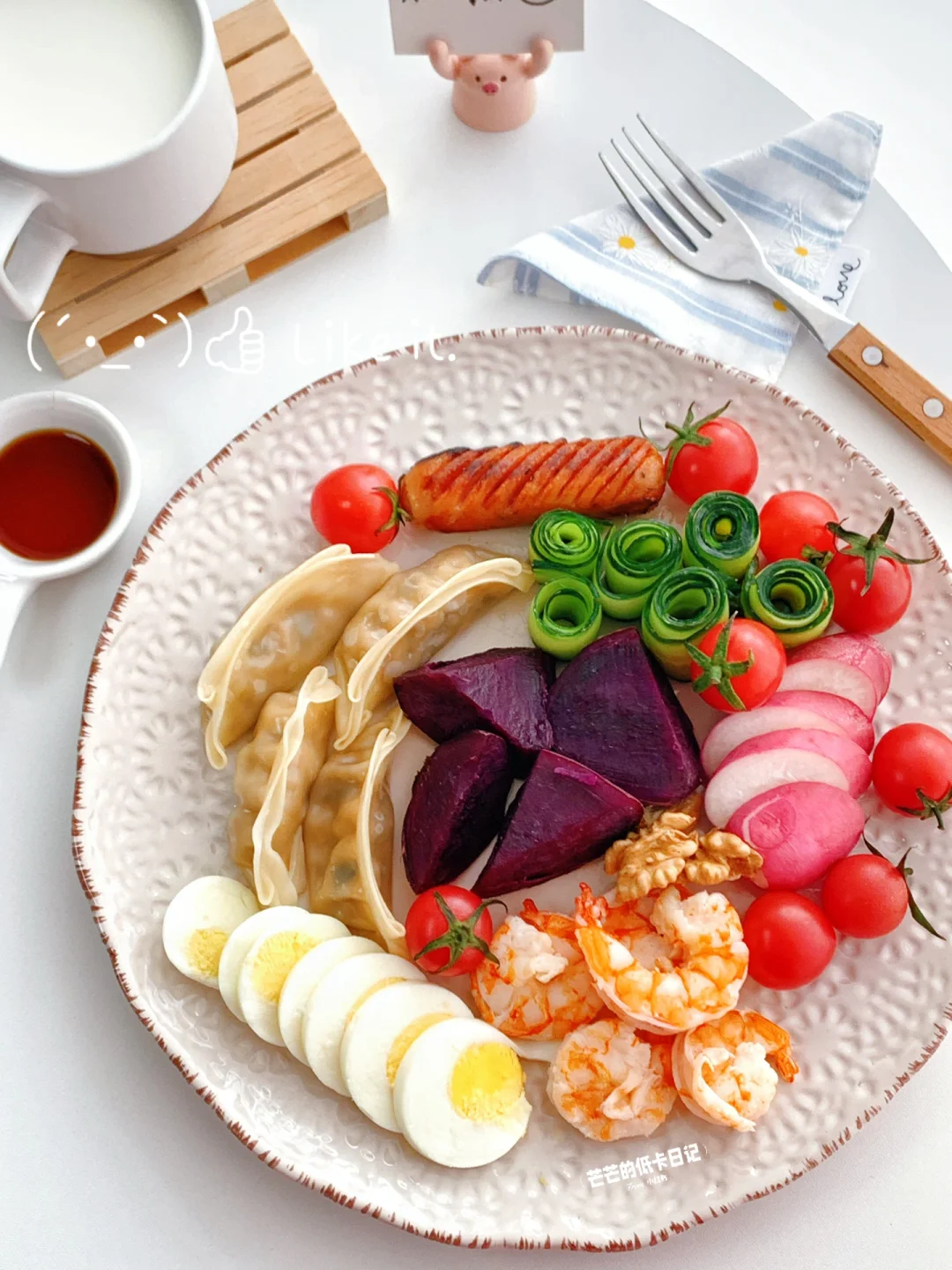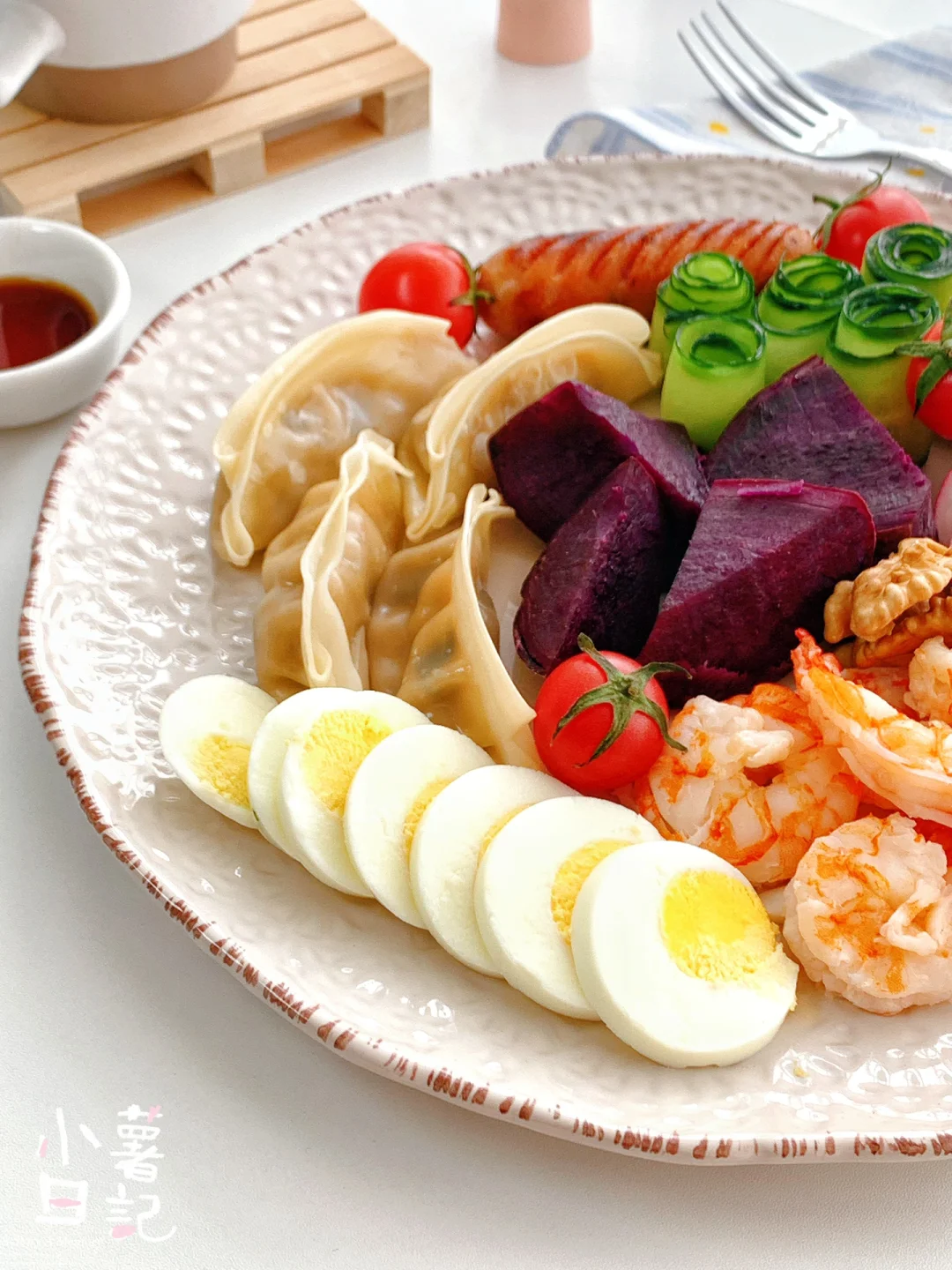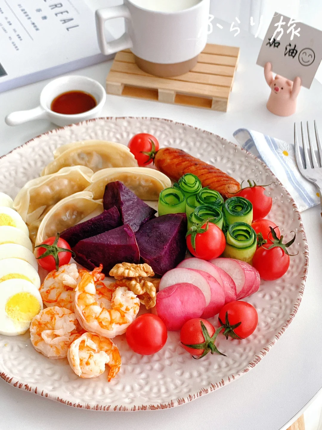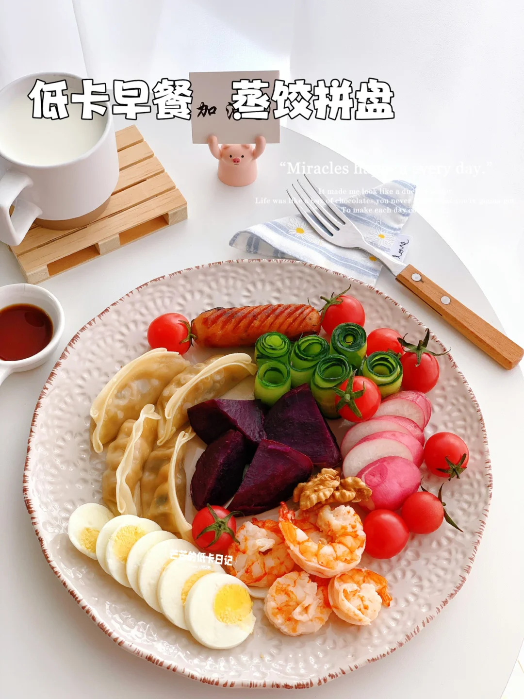 早班就要吃拼盘:今日早餐拼盘【韩式蒸饺紫薯拼盘】 [飞吻R]hi,姐妹们,我又来分享减脂餐啦❗️进入主页🈶很多有手就会的家常减脂餐~~ ………………………………………………………………………………… [向右R]拼盘: 主食:蒸饺🥟,紫薯 蛋白质:虾仁🍤,膳食肠,鸡蛋 膳食纤维,维生素:黄瓜🥒,小番茄🍅,水果萝卜 优质蛋白质:纸皮核桃 ✨✨夏天来了,让我们一起打卡,不饿肚子,快乐变瘦吧~~