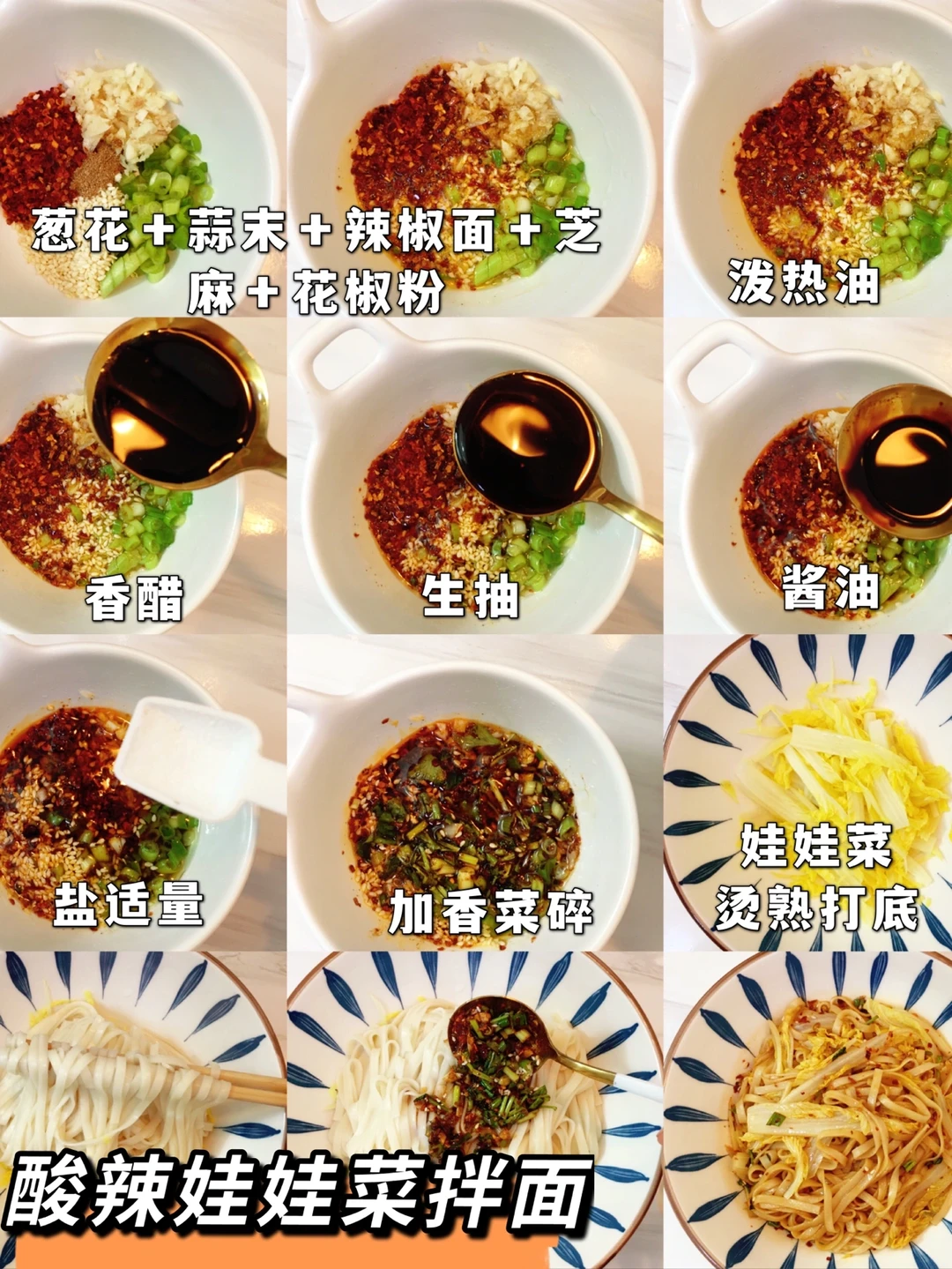 🆎娃娃菜打底,加入煮好的面条,淋上酱汁拌匀即可。