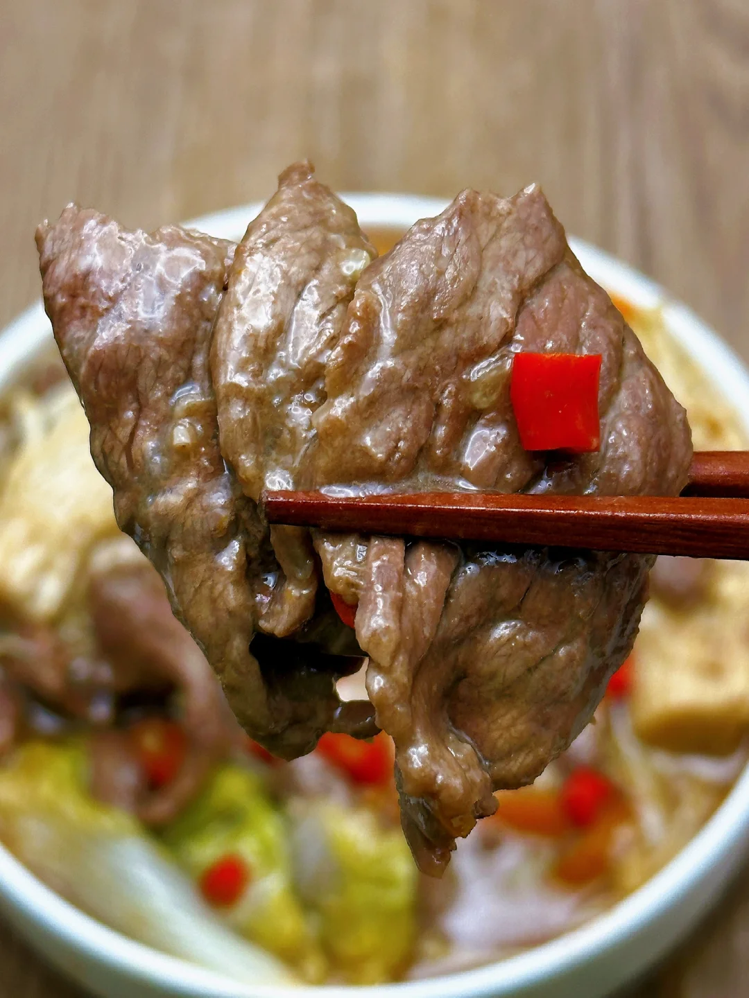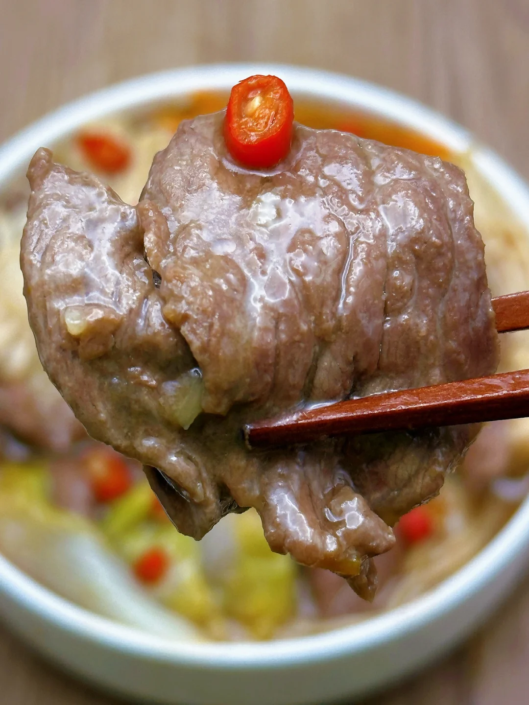 3️⃣再铺上牛肉和辣椒再煮三分钟就可以出锅啦~