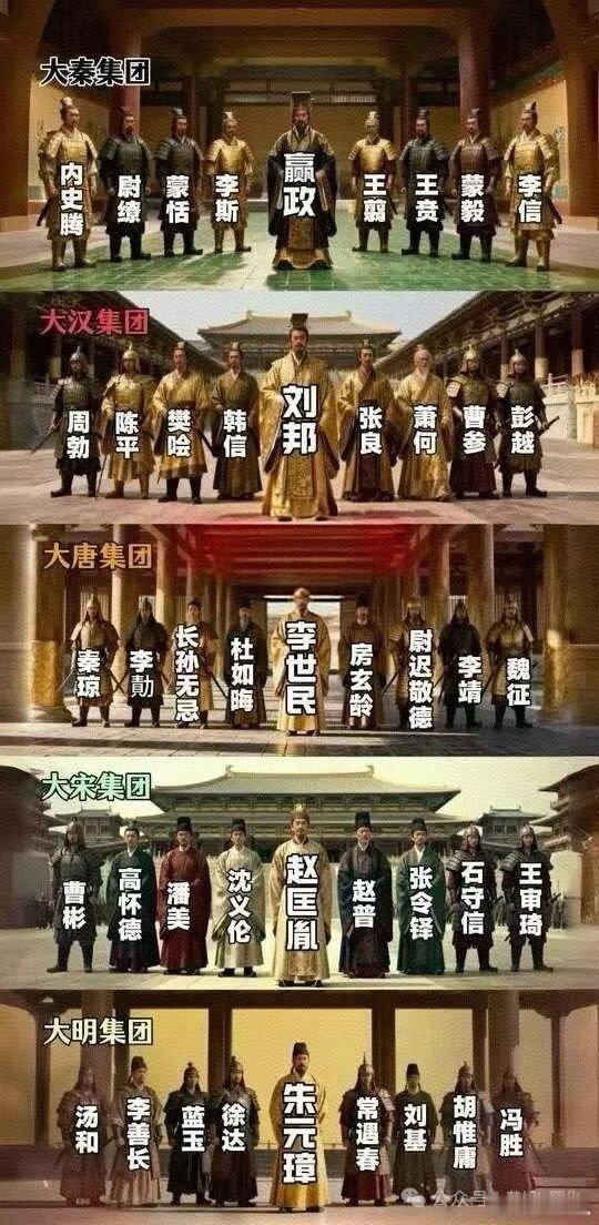 中国历史上五大皇家创业集团大秦集团,董事长嬴政,文官李斯,武将王翦。大汉集团,董事长刘邦,文官萧何,武将韩信。大唐集团,董事长李世民,文官房玄龄,武将李靖。大宋集团,董事长赵匡胤,文官赵普,武将曹彬。大明集团,董事长朱元璋,文官刘基,武将徐达。