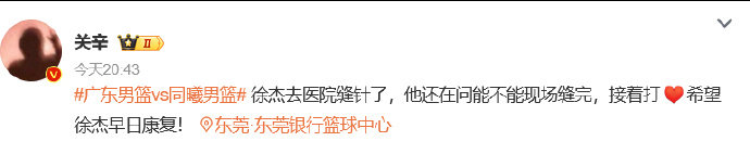 徐杰受伤12月14日,广东迎来了新赛季的首场比赛,球队后卫徐杰在半场结束前受伤离场。相徐杰前往医院进行了眉骨缝针。后续消息,徐杰已经缝针完毕,缝了三针。徐杰表示没啥事。