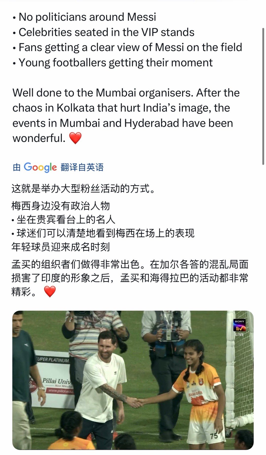 生怕第一站组织的混乱插曲给GOAT留下不好印象,抹黑印度形象,随着第二站海德巴拉、第三站孟买的顺利举办,梅西印度行连续两场活动有序推进,X上印度人悬着的心终于可以放下了🤣梅西印度行圆满推进梅西印度活动只待10分钟球迷怒砸场梅西印度活动只待10分钟惹怒球迷
