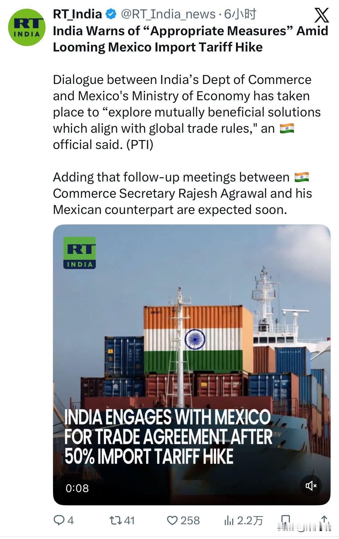 印度警告称,面对墨西哥即将上调进口关税,将采取“适当措施”。 一位官员表示,印度商务部和墨西哥经济部已举行对话,旨在“探讨符合全球贸易规则的互利解决方案”。(印度报业 ) 并补充说, 印度商务部长拉杰什·阿格拉瓦尔与墨西哥对口官员之间的后续会晤预计很快举行。