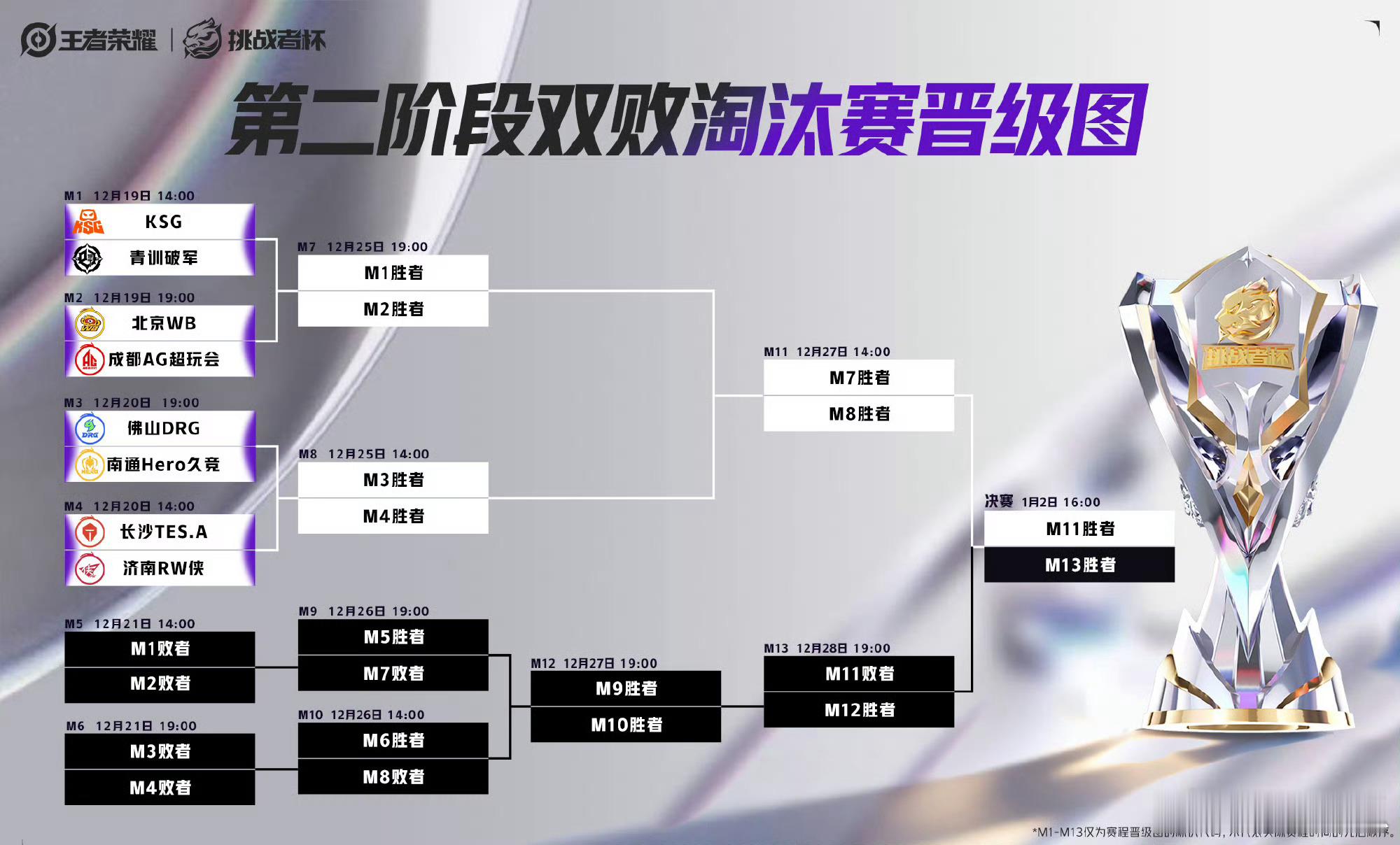 第二轮时间表 *M1 12月19日 14: 00 KSG vs 青训破军*M2 12月19日 19: 00 北京WB vs 成都AG超玩会*M3 12月20日 19 : 00 佛山DRG vs 南通Hero久竞*M4 12月20日 14: 00 长沙TES.A vs 济南RW侠