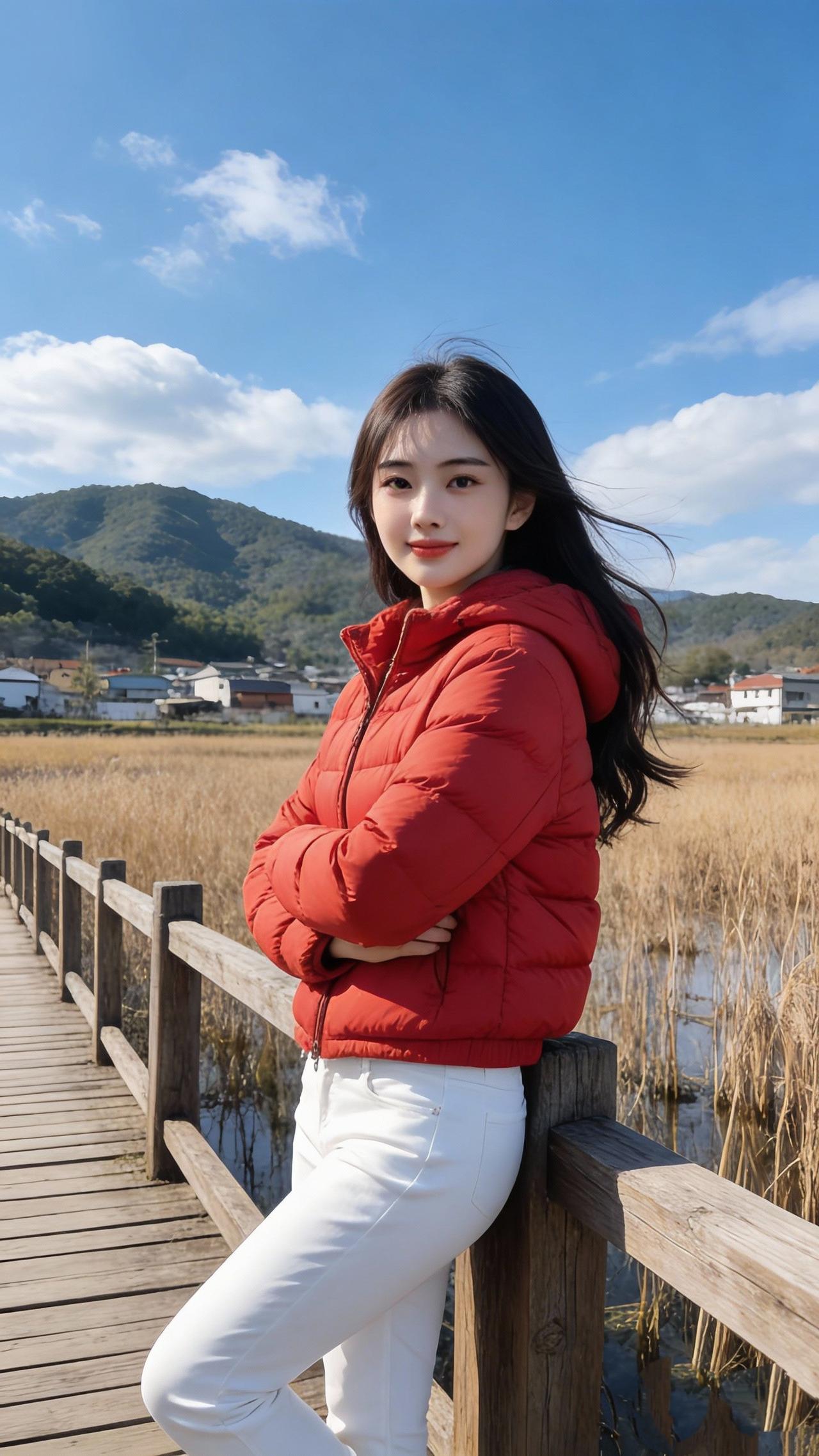 《汀桥红影》 晴川浮玉云舒卷, 远岫堆青接野田。 一抹红襟依木栈, 风摇芦穗落晴烟。 赏析:诗歌先描绘画面中的远景:澄澈的天空飘着白云,远处青山连着金黄的田野,勾勒出开阔明朗的秋日郊野景致。后将视线落于人物,“一抹红襟”精准点出红色羽绒服的视觉亮点,与素白的裤子、棕木的栈道形成鲜明色彩对比;末句“风摇芦穗落晴烟”以动态的芦苇摇曳收尾,让静态的人物与灵动的自然相融,营造出清新又温暖的秋日氛围。 湖畔闲景赋 绿柳红舟 汀岸闻箫临 鹭栖烟汀 汀岸 汀洲红叶 雾隐汀