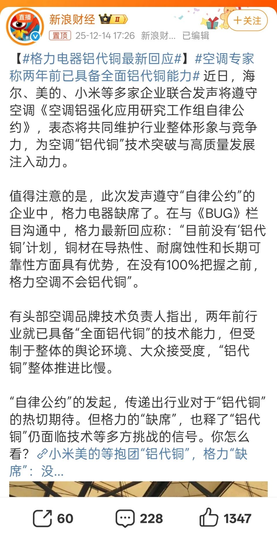 格力电器铝代铜最新回应应该主要是为了控制成本吧,据说铜的价格涨了不少。肯定还是铜的好,估计以后铜的和铝的都有,价格高的用铜,铝的价格更低,让消费者自己选。