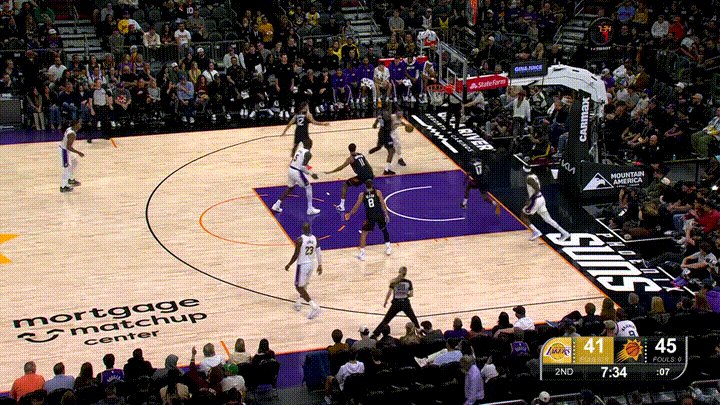 湖人超级巨星詹姆斯的篮下脚步真是太华丽了!在今天湖人客场挑战太阳的比赛中,当时比赛进行到了第二节的七分多钟,詹姆斯在三分线外接到队友东契奇的传球后持球强杀篮下,只见詹姆斯在篮下大秀自己的脚步,最后投进了一记让人叹为观止的压哨漂移跳投,帮助球队将场上分差缩小到了只有2分。