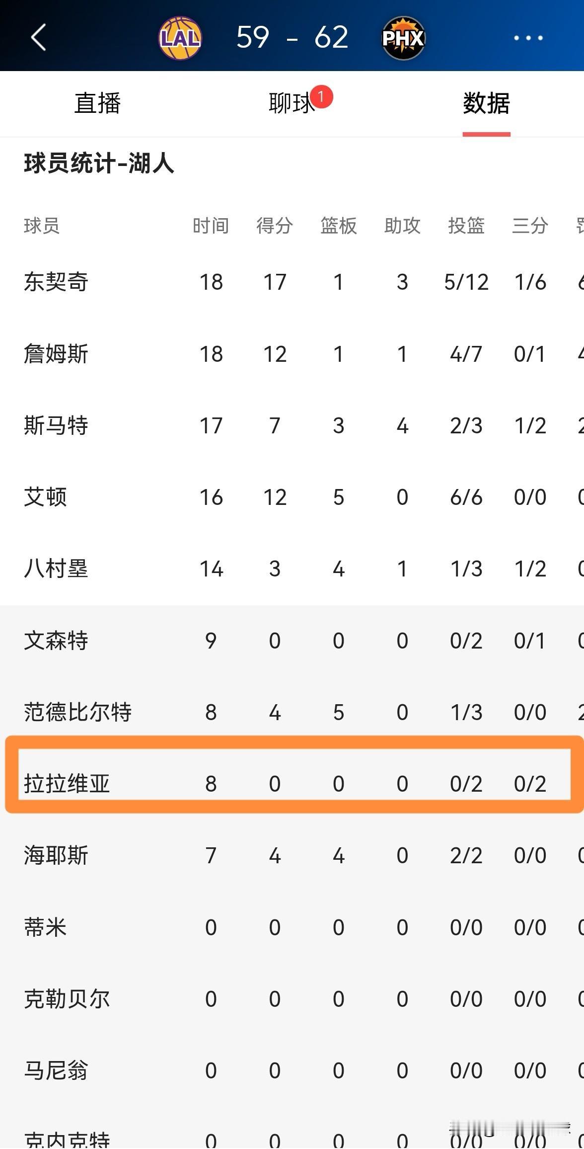 我强烈建议湖人主帅雷迪克弃用拉拉维亚!在今天湖人客场挑战太阳的上半场比赛中,拉拉维亚替补出战8分钟,投篮2中0怒砍0分0篮板0助攻0抢断0盖帽,他的场上正负值为全队最低的-14。毫不客气的说,拉拉维亚在场上完全是毫无作用。 我强烈建议雷迪克教练果断弃用拉拉维亚,并且重新启用小将克内克特,起码克内克特的投篮能力比拉拉维亚强。