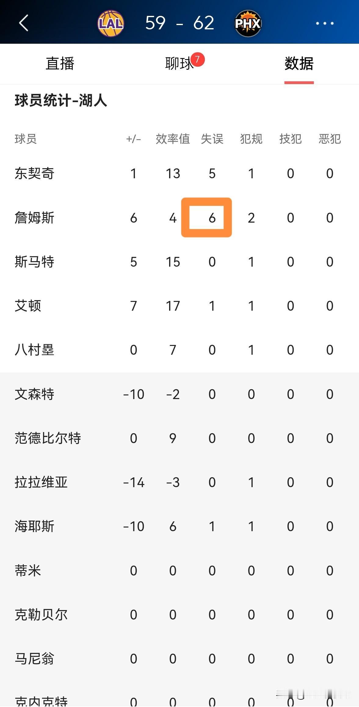 湖人超级球星詹姆斯的调整能力真是太强了!在今天进行的湖人和太阳的比赛中,目前双方半场战罢,湖人以59:62落后于对手。在前两节比赛中,詹姆斯首发出战18分钟,投篮7中4,其中罚球8中4得到12分,出现了6次失误。 值得注意的是,詹姆斯在第一节比赛中就出现了5次失误,他在次节比赛中及时的调整好了状态仅仅出现了1次失误。