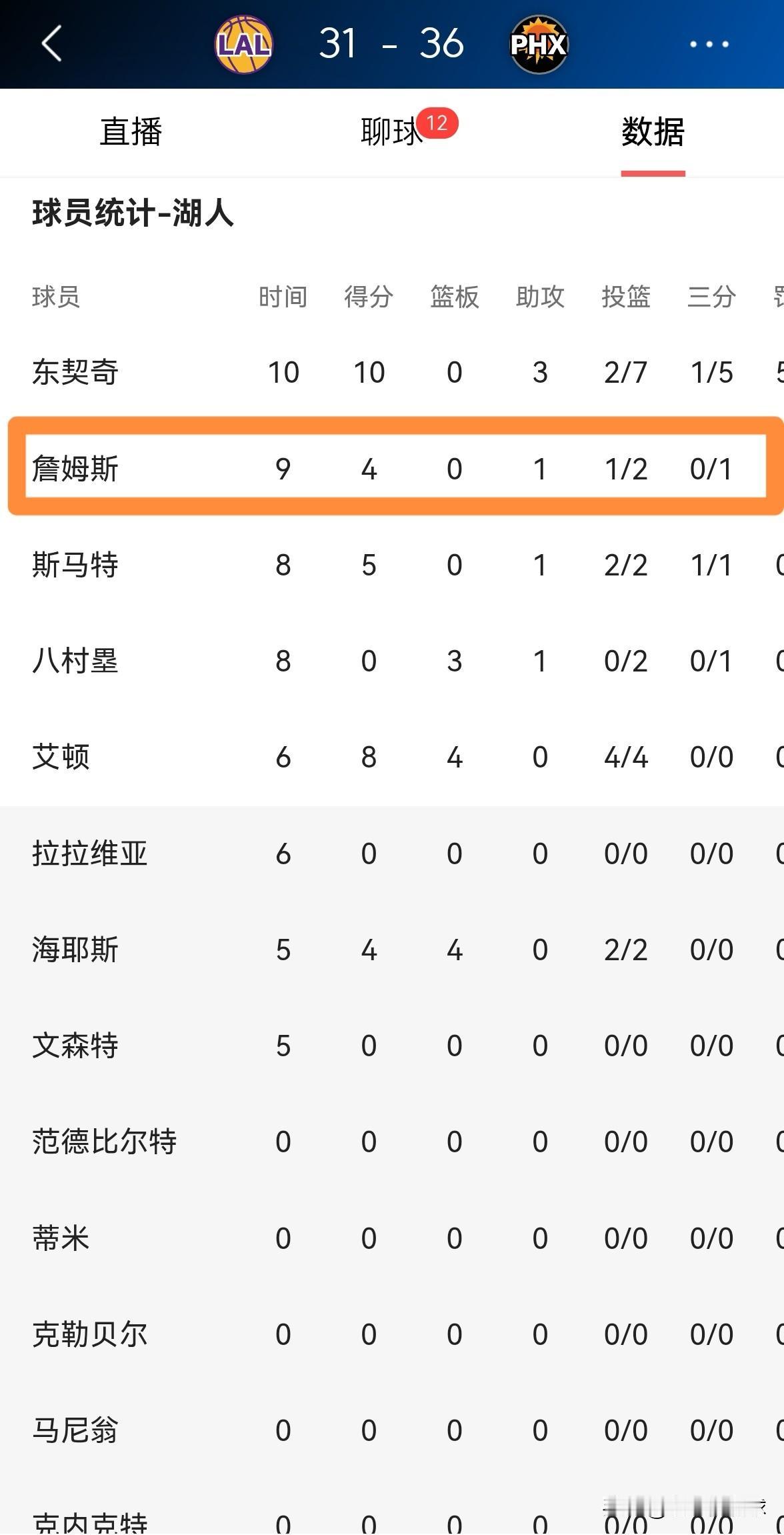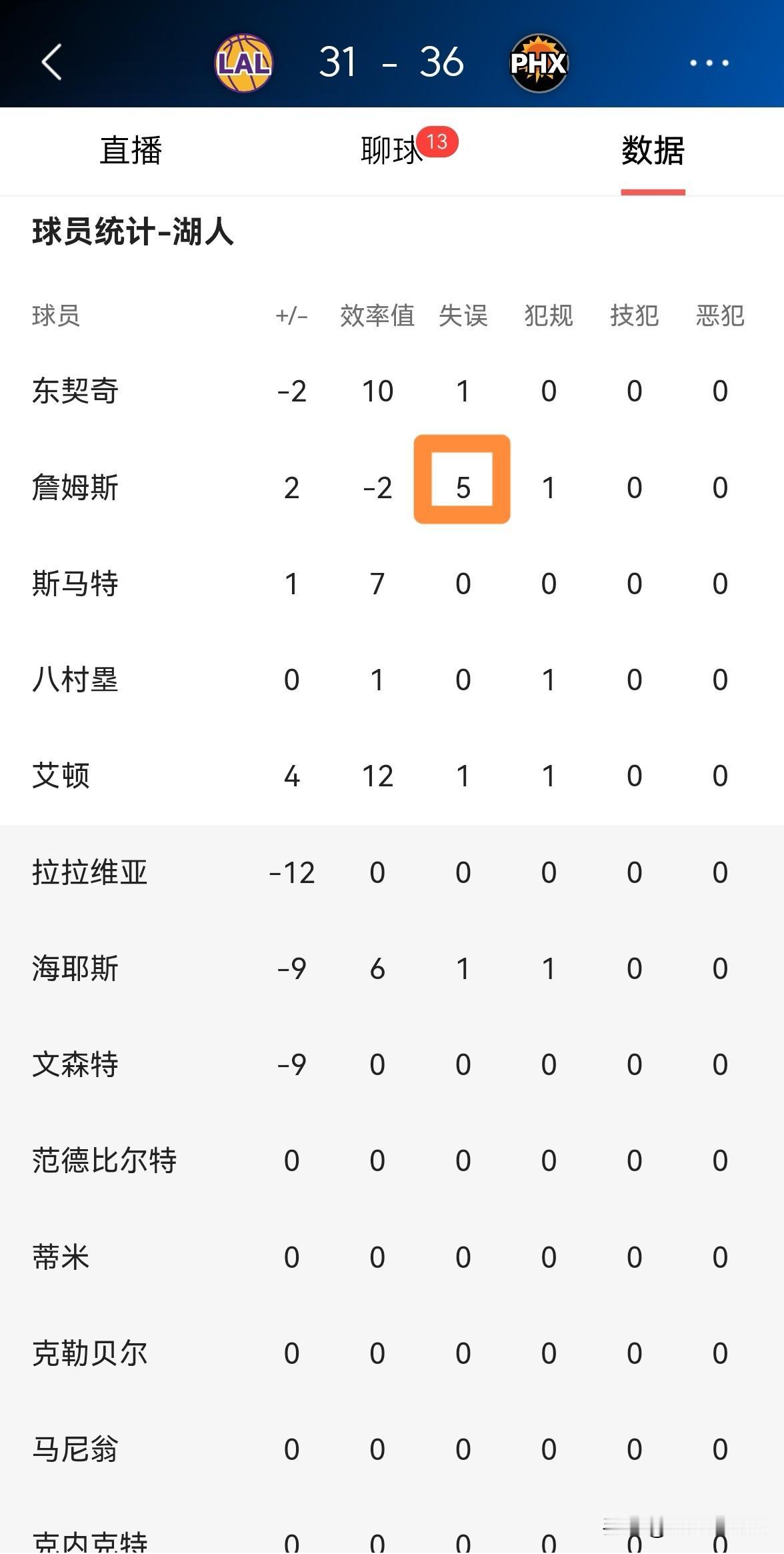 湖人超级巨星詹姆斯真是让人失望透顶,他单节比赛怒送5次失误!在今天湖人客场挑战太阳的比赛中,目前双方的第一节比赛已经结束,湖人以31:36落后于对手。让人感到震惊的是,在首节比赛中,詹姆斯首发出战9分钟,投篮2中1,其中罚球3中2仅仅得到4分,却出现了多达5次的失误。 照这样发展下去的话,本场比赛詹姆斯的失误数极有可能会上双。