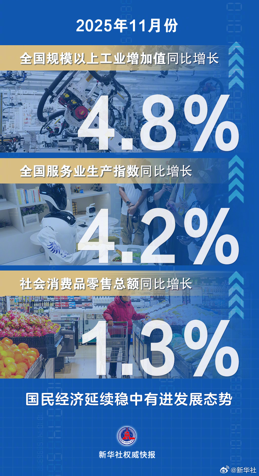 【新华社权威快报|11月#国民经济延续稳中有进发展态势#】国家统计局12月15日发布数据显示:11月份,全国规模以上工业增加值同比增长4.8%,全国服务业生产指数同比增长4.2%,社会消费品零售总额同比增长1.3%,国民经济延续稳中有进发展态势。(记者:王雨萧 黄垚)