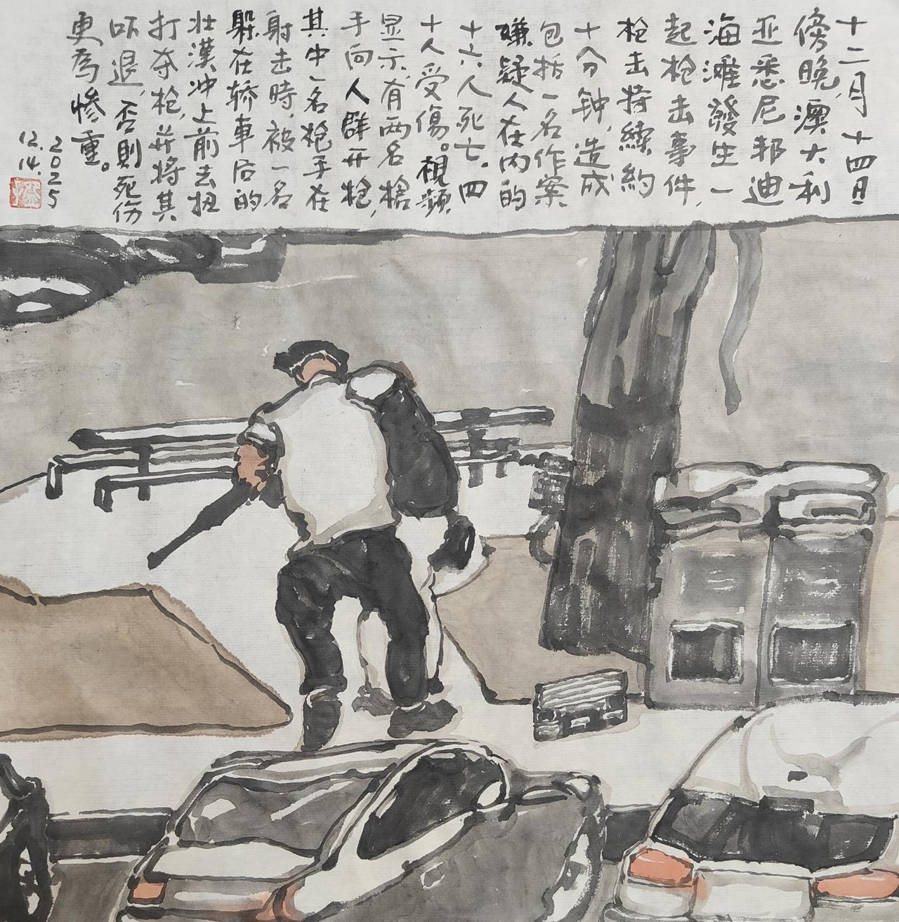 2025碗子记事:12月14日傍晚,澳大利亚悉尼邦迪海滩发生一起枪击事件,枪击持续的10分钟,造成1名作案嫌疑人在内的16人死亡,40人受伤。视频显示,有2名枪手向人群开枪,其中1名枪手在射击时,被1名躲在轿车后的壮汉冲上前去扭打夺枪,并将其吓退,否则死伤更为惨重。2025.12.14.碗子记之