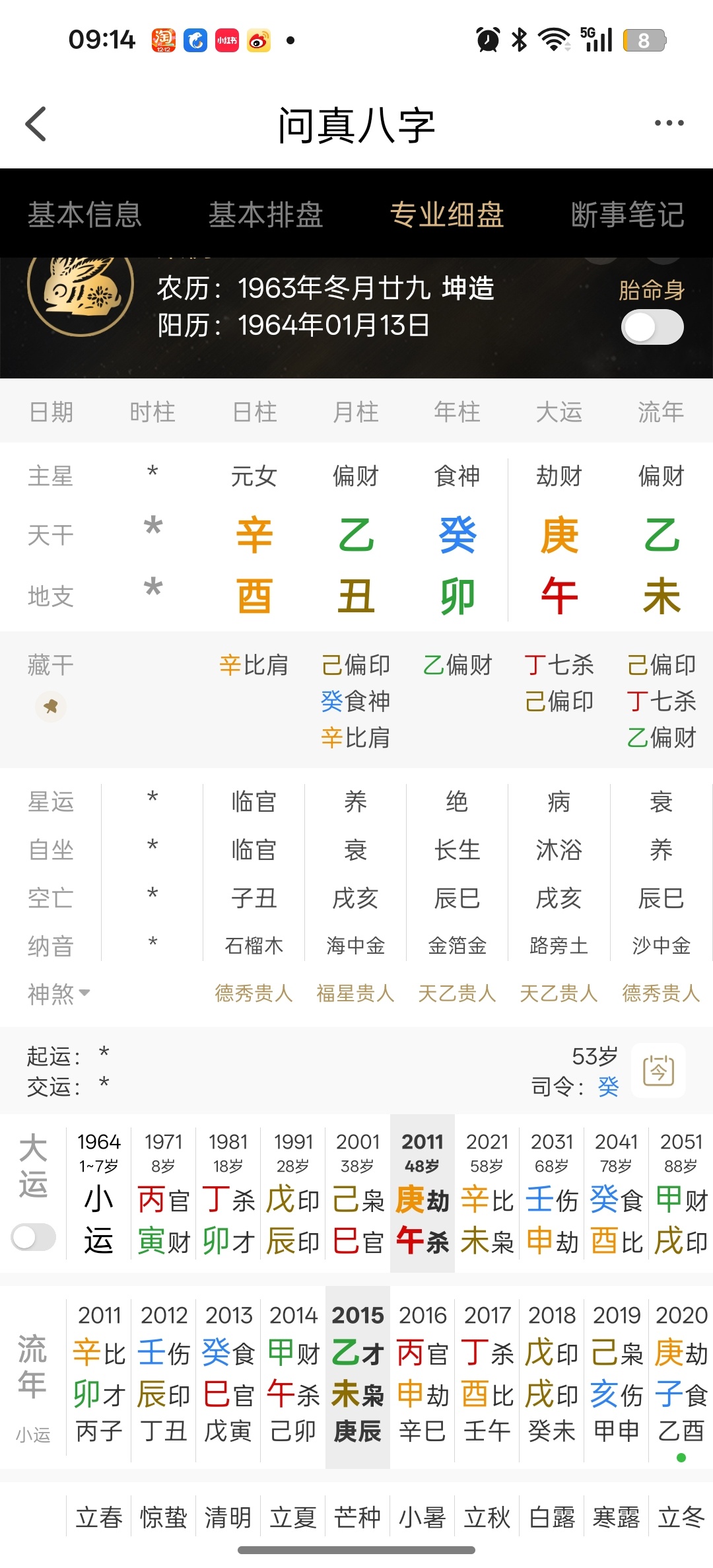 何晴父母均因脑溢血离世何晴 许亚军 我认为何晴并不是农历生日,本身性格直率坦诚,她自述“在人情世故、与人交往上都很差”,说话直接,不擅长伪装,常因直言得罪人。例如,她曾极力劝阻好友黄绮珊整容,认为“没必要改变自己”。 其直率性格也体现在职业选择上,如敢与导演叫板,拒绝局限于古典角色,尝试突破戏路。好友评价她“疾恶如仇”,感情中敢爱敢恨,生活里保有“用自己的嘴巴说话”的真诚。面对疾病时表现出外柔内刚的韧性,抗癌十年不愿卖惨,晚年拒绝用情怀换钱。这不就是辛酉日吗?影迷为其过生日过的也是公历的1月13日,本人并没有什么意见。唯一的婚姻是进入戊辰运后,丙子流年,有火来照,与许亚军走在一起。当时男方已婚,对应辛酉九丑日。顶着舆论争议走到一起。九丑日,不是长的丑,是长得漂亮个人魅力强,然后容易在感情上犯名声不好的问题。是别人在九丑日的面前会觉得自己长得丑。但进入己巳大运,巳酉丑和局又很难维持下去。双方分歧在男方希望女方多顾家庭,而何晴太爱演戏。食神生财的命局,怎可能甘心待在一方小小天地。2015年,何晴就被确诊罹患脑瘤,后期还做过颅脑手术,语言表达受影响。 为何得脑瘤?猜测是丑月(癸水司令),卯木带癸寒冻,所以卯木必然有所损伤。卯透干到乙,乙在丑上同样没有生长性。而卯/乙受克,是从庚午运开始。2015年前后,正是乙木露头见金,庚金马上落地的时间点,次年庚运申年,实质克木。卯为年柱,为头部神经。金合克卯木就是开刀了。究其病因,丑字湿寒沉重问题很大,实际上何晴的疾病与母亲相同,就是从母亲(丑土印星)处遗传而来。