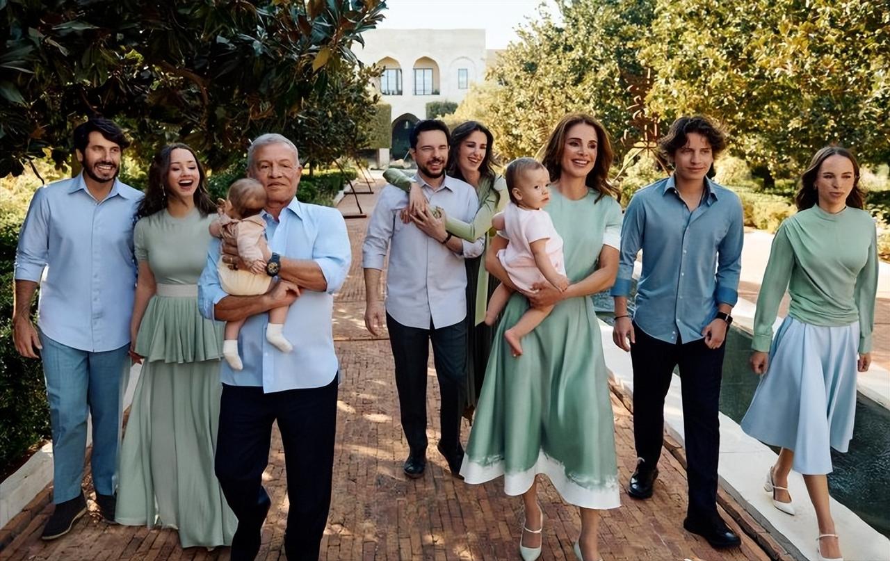 12月13日,约旦王室发布约旦国王一家的圣诞全家福,祖孙三代齐齐亮相,还穿着家庭装,难得城市,女眷统一都是豆绿色连身裙,满满都是温馨和平淡的幸福。 阿卜杜拉二世抱着外孙女阿米娜,拉尼亚王后抱着孙女伊曼,国王满头白发,和妻子拉尼娅王后相比就像两代人。 拉尼娅王后抱着孙女伊曼,大波浪卷发,一点不像年过半百的奶奶,依旧年轻美丽,韵味十足。 和身后的儿媳拉杰瓦,两侧的两个女儿,同框的拉尼娅就像姐妹花,和儿媳、女儿们毫无年龄差。
