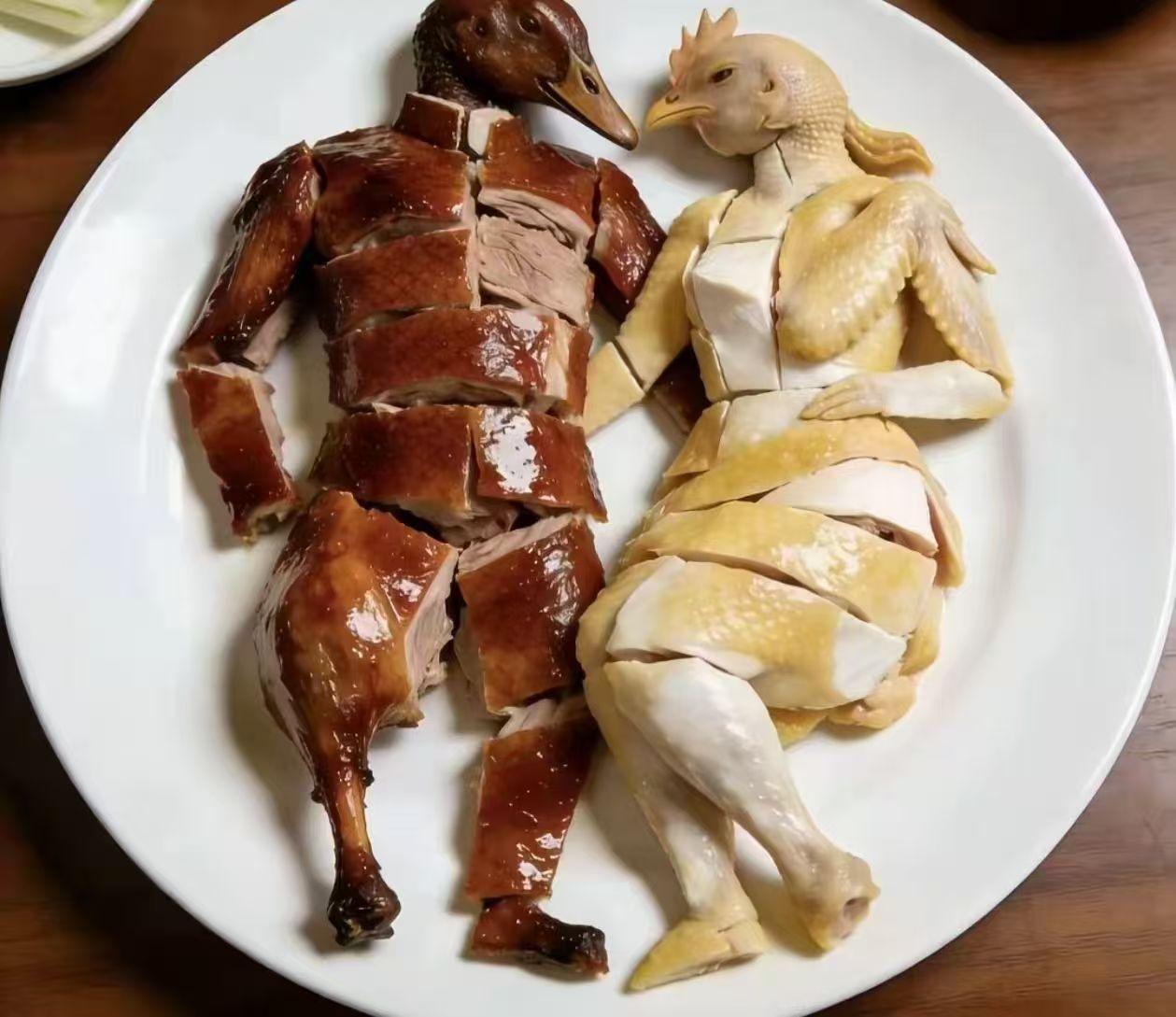 创意摆盘!烤鸭与整鸡的完美结合,色香味俱全!请在股市里的兄弟姐妹们吃大肉a股要大