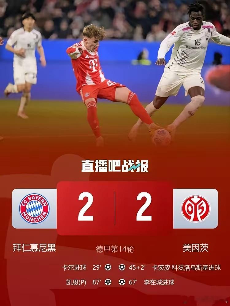 德甲第14轮 拜仁、多特皆被逼平,莱比锡输球,下一轮比赛后德甲将进入冬歇期。积分榜:拜仁38分领跑,莱比锡、多特蒙德29分紧随其后,勒沃库森、霍芬海姆26分;美因茨7分垫底,海登海姆、圣保利11分。射手榜:凯恩18粒进球遥遥领先伯卡特的8球;助攻榜:奥利塞8助,伊利奇、沙伊比、迪亚斯6助。德甲