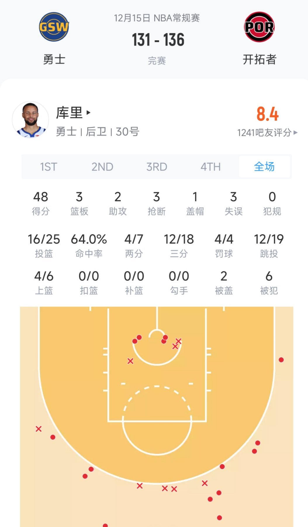 库里48分!勇士憾负开拓者!勇士vs开拓者