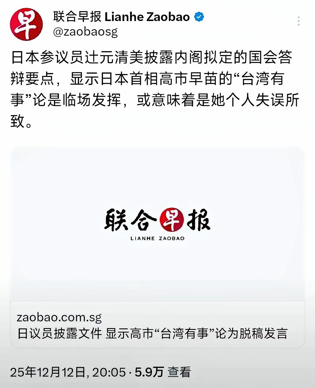 这就是狡辩——日本参议员过元清美披露内阁拟定的国会答辩要点,显示日本首相高市早苗的"台湾有事"论是临场发挥,或意味着是她个人失误所致。 这不是个人失误,如果是失误,大可以痛快地承认并道歉,但高市早苗没有。而从事后高市早苗和小泉进次郎立刻通过电话或视频向美国总统特朗普、赫格塞思以及北约秘书长吕特等一些被视为盟友国家或组织的领导人和国防官员寻求支持的举动看,高市早苗的恶劣言论就是日本政府的本意。任何解释都是欲盖弥彰。 我们没有误解日本的本意。我们清楚地知道,高市早苗的出现不是偶然现象,它是日本意欲复活军国主义无法掩盖的必然现象,没有现在的高市早苗也会有其他的低市晚苗说出这些话。事实上,“台湾有事就是日本有事”、“台湾距离日本很近,就像牙齿和嘴唇一样”等这些日本高官说过的话和高市早苗说的台湾有事是“日本存立危机”并威胁对中国动武没有任何区别,这种思维从未从日本彻底删除和得到彻底清算。 现在高市早苗给了我们这样一个机会,我们当然不会放过,如果不能就此斩断它“肮脏的头颅”,给日本军国主义留下继续存活的空间就是对日本这个罪犯国家的放纵和中国人民极大的不公。