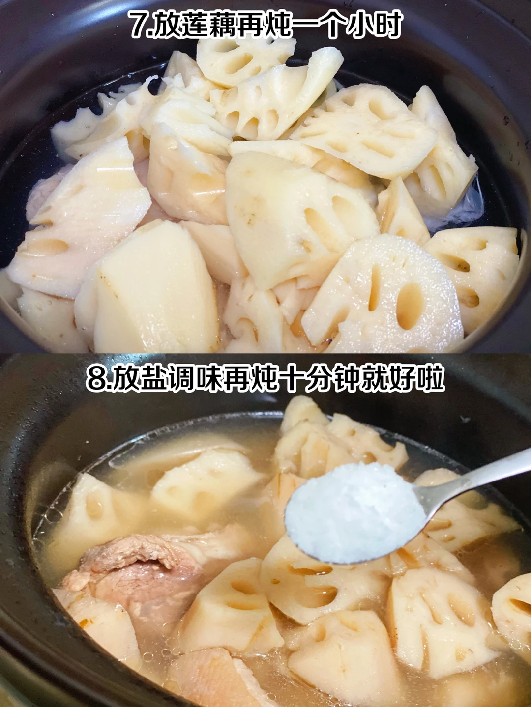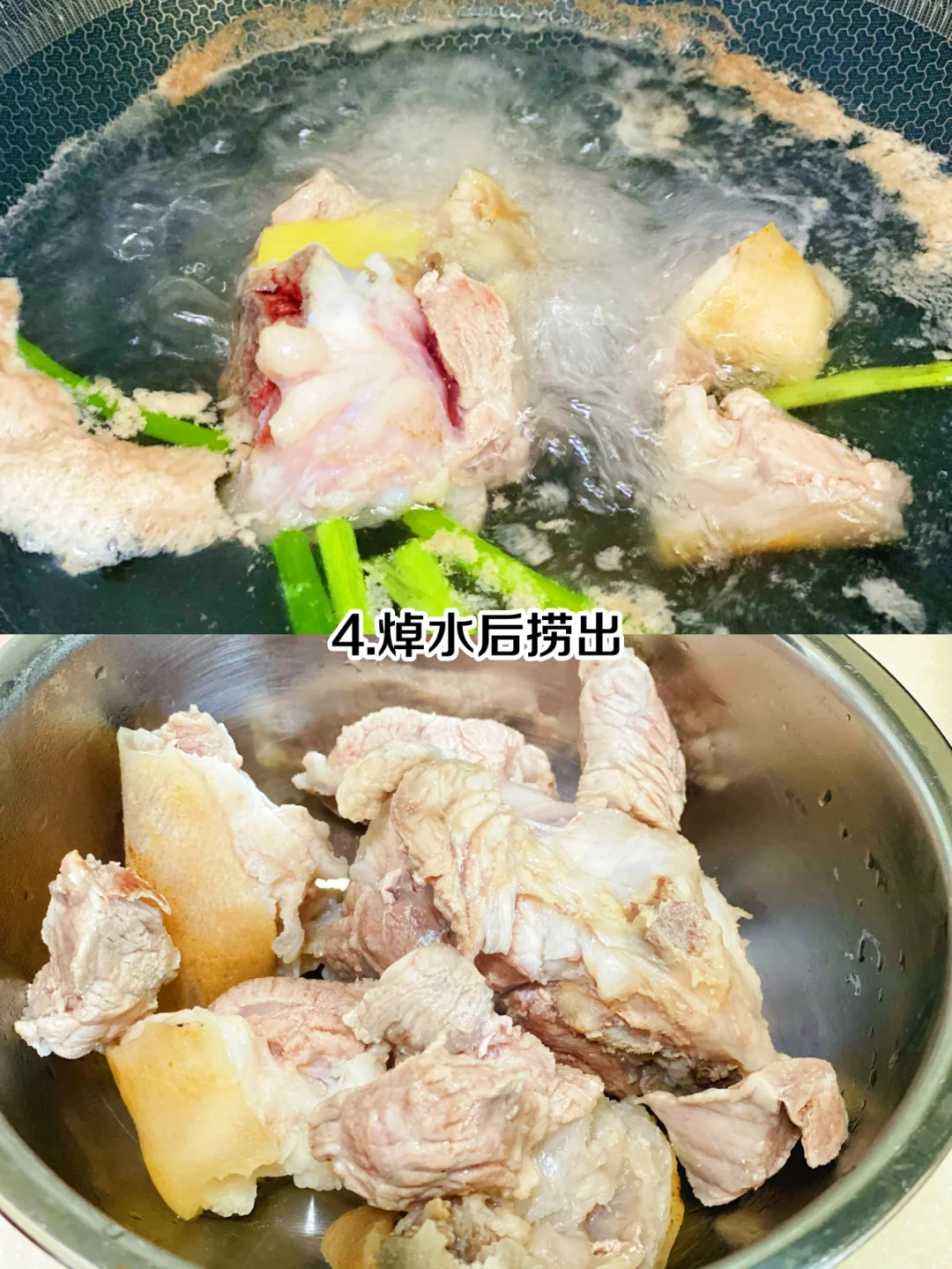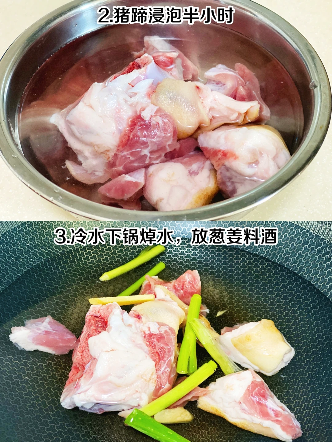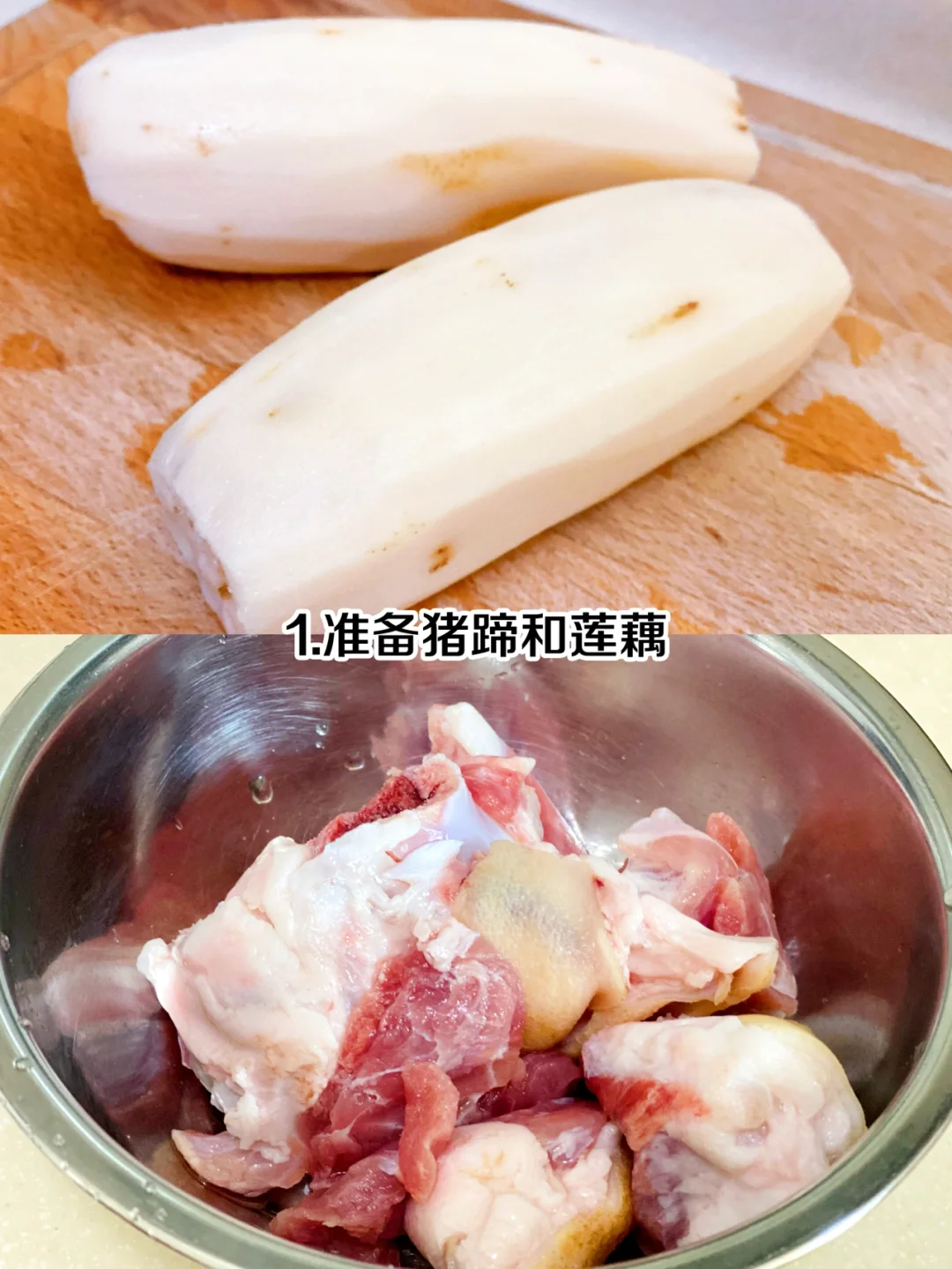 步骤🌟 1、准备猪蹄和莲藕 2、猪蹄浸泡半小时 3、冷水下锅焯水,放葱姜料酒 4、焯水后捞出 5、藕切成滚刀块 6、另起炖锅放水,把猪蹄放进去炖一个小时 7、放莲藕再炖一个小时 8、放盐调味再炖十分钟就好啦 喜欢喝藕汤的可以试试这样炖哦,猪蹄Q弹,莲藕粉糯,汤汁清爽!👍👍