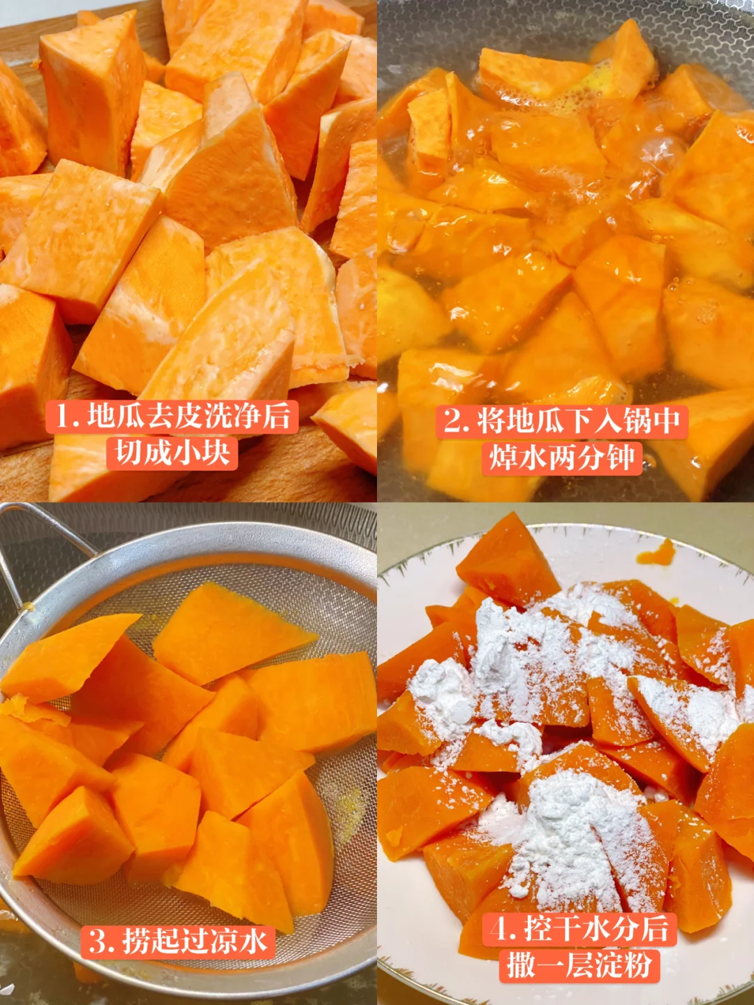 地瓜这么吃,外脆里糯,是孩子们的最爱 拔丝地瓜的家常做法: 1、地瓜去皮洗净后切成小块 2、把水烧开,将地瓜下入锅中焯水两分钟,捞起过凉水 3、控干水分后撒一层淀粉 4、油锅烧热起小泡,下入地瓜,炸20秒左右定型,再转中小火炸3-4分钟就可以捞起来了。 5、一勺水一勺糖中火熬制,搅到颜色变成褐色,下入地瓜裹上糖浆。 这次我采用的是超大个