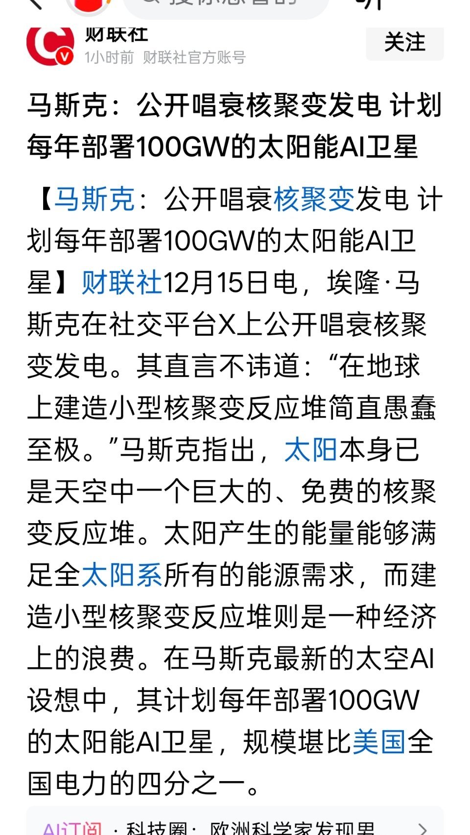 马斯克公开唱衰核聚变发电。计划每年部署100GW的太阳能AI卫星