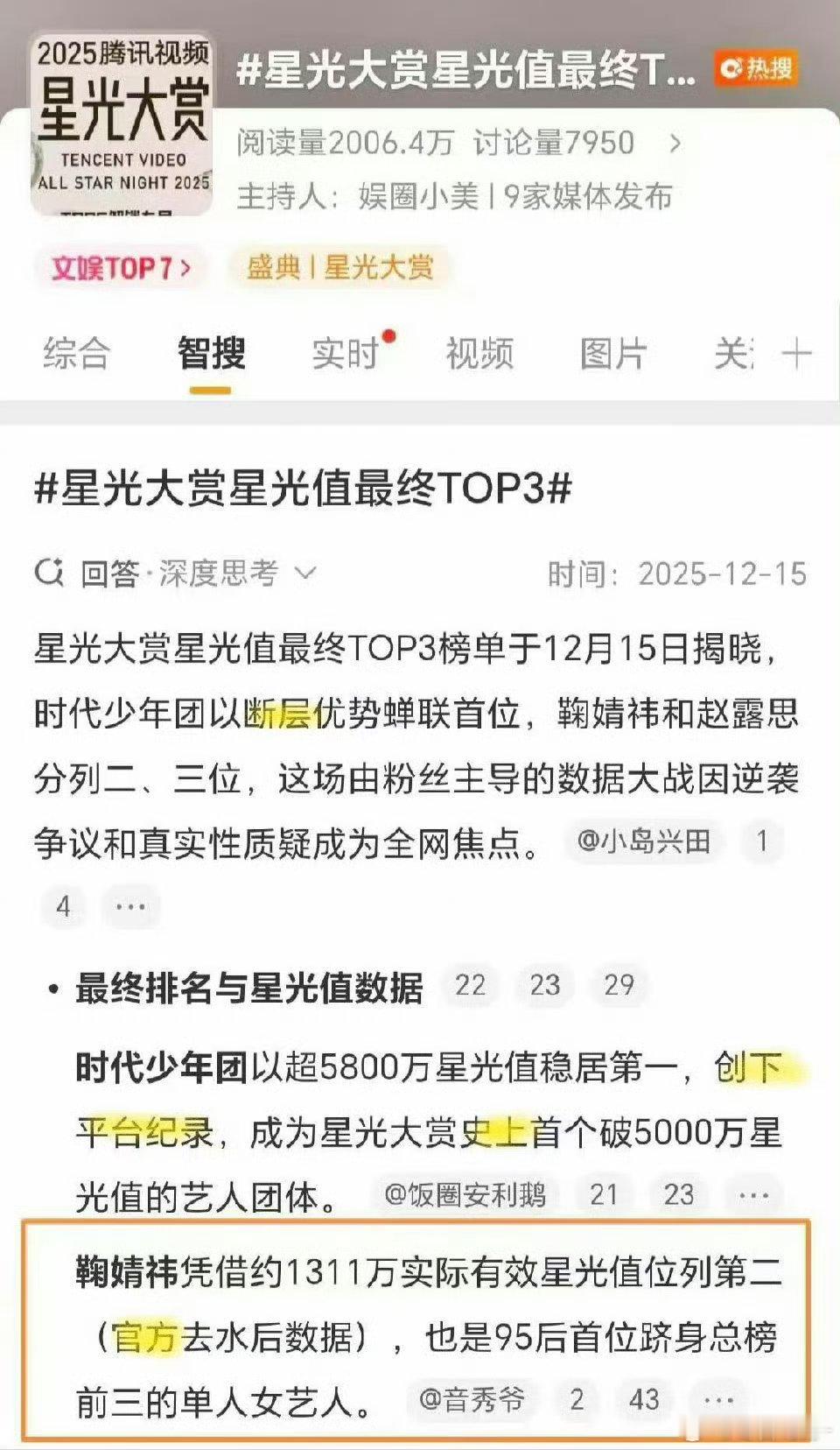 星光大赏星光值最终TOP3 输给内团一不丢人
