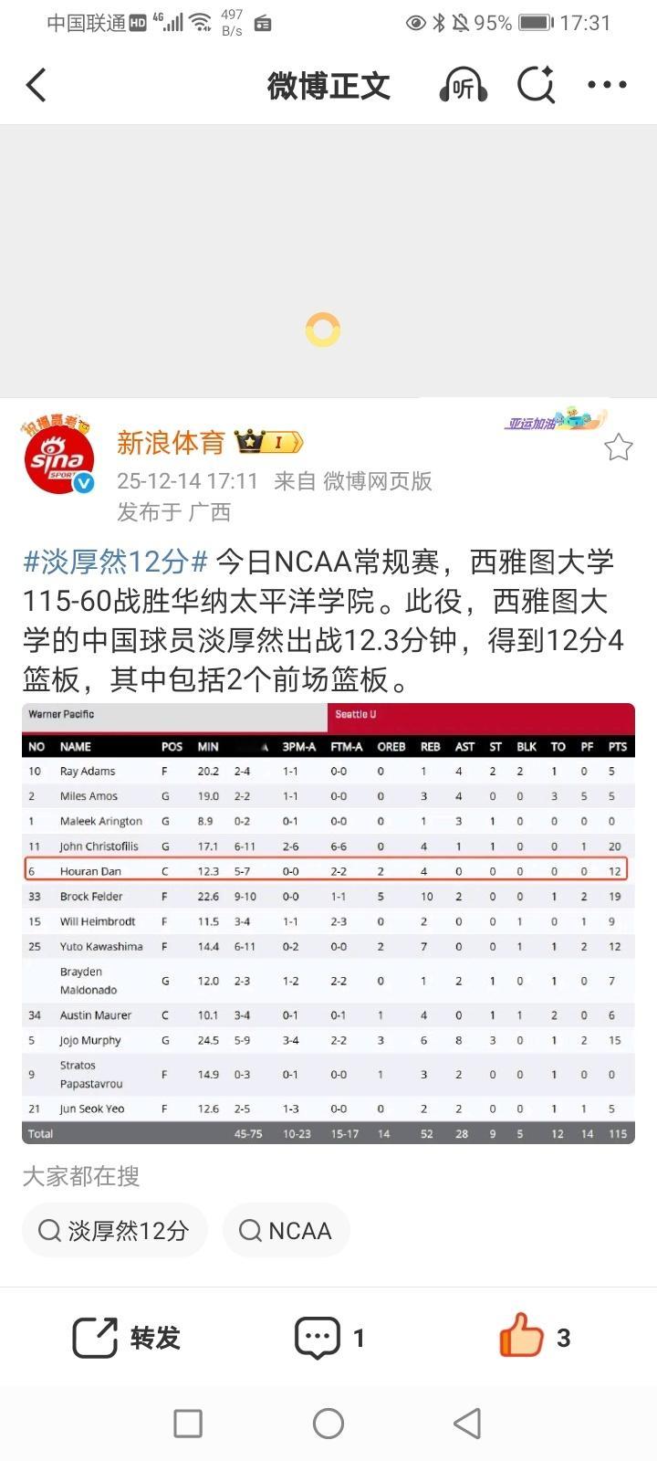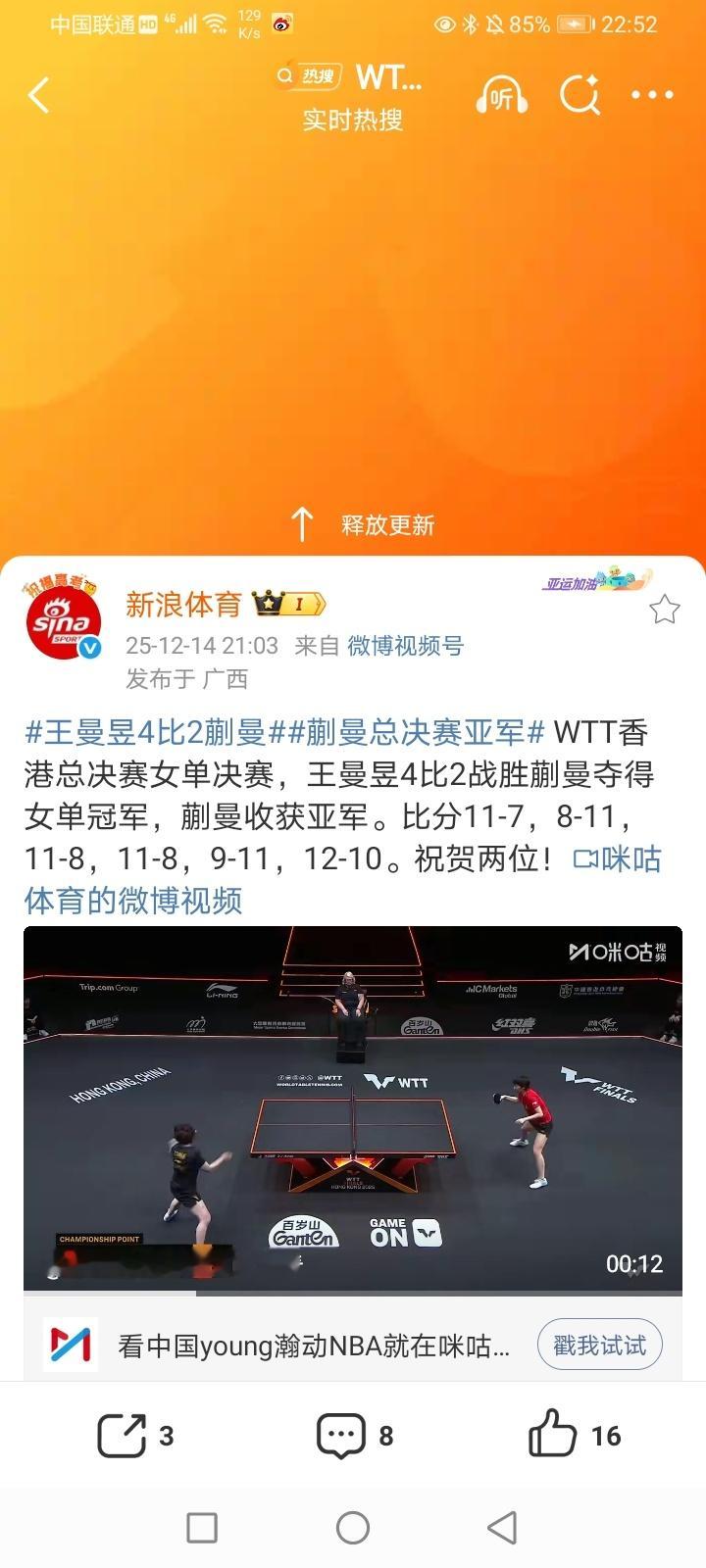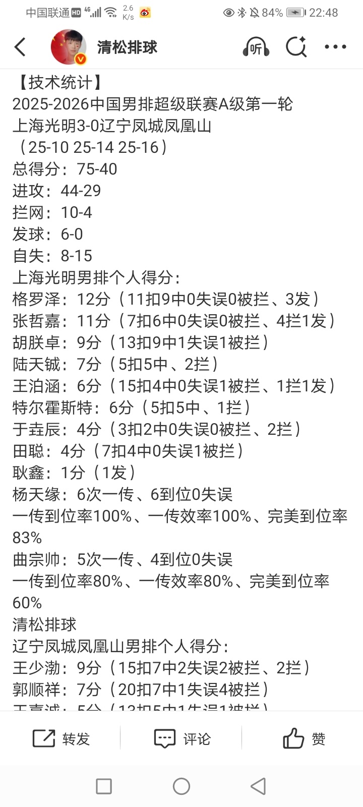 2025年12月15日-2026米兰冬奥会冰壶混双落选赛首轮 中国9-3大胜匈牙利/第2轮 中国12-4大胜法国(中国混双冰壶队获得两连胜) 2025-2026CBA常规赛首轮(第一阶段首轮) 广东107-102加时战胜南京(同曦)(潜力赛:13-32)/上海95-85逆转战胜吉林(弗格转会上海男篮赛季首秀得到9分/张镇麟(金金)替补出场得到4分/赵率舟转会吉林男篮赛季首秀得到12分/刘雁宇7分)/浙江稠州101-106加时爆冷被宁波逆转 2025-2026WCBA常规赛A组第5轮(第一阶段第5轮) 东莞(广东)83-75逆转战胜四川(卫冕冠军广东女篮获得五连胜 暂列积分榜榜首/上届亚军四川女篮终结四连胜 遭遇首败/上海71-82山西(山西女篮获得三连胜)/北京70-55大胜浙江(浙江女篮遭遇三连败 暂列小组积分榜倒数第二) B组第5轮(第一阶段第5轮) 厦门97-74大胜合肥(厦门女篮获得三连胜) 2025-2026女排超级联赛B级常规赛第一阶段首轮 广东(深圳)3-1河北(25-15 25-21 23-25 25-14) 2025-2026男排超级联赛A级常规赛第一阶段首轮 上海3-0辽宁(25-10 25-14 25-16)(卫冕冠军上海男排取得开门红)/河北2-3爆冷惜败广东(21-25 25-18 16-25 25-16 20-22)(上届亚军河北男排无缘开门红)/天津3-2逆转险胜北京(23-25 25-19 22-25 25-22 15-11)/山东0-3浙江(28-30 23-25 21-25) B级常规赛首轮 江苏3-1云南(25-23 25-22 23-25 25-21)/福建3-0河南(25-17 35-33 25-14)/四川2-3惜败湖北(22-25 25-22 21-25 25-15 12-15) 第十五届残特奥会辽宁队战报:盲人男足小组赛第7轮 辽宁1-0小胜上海(辽宁盲人男足终结两连败 目前3胜4负)/五人制轮椅男篮半决赛 广东一团83-33辽宁(辽宁五人制轮椅男篮无缘决赛 将与浙江争夺季军)/聋人男篮5-8名排位赛 辽宁92-95被天津逆转/聋人女篮半决赛 广东一团65-88辽宁(辽宁聋人女篮晋级决赛 将与浙江争冠)/特奥男篮决赛B组 西藏37-25辽宁 坐式女排3 4名决赛 辽宁3-0山东(25-8 25-14 25-17)(辽宁坐式女排获得季军) 特奥足球队制比赛决赛 辽宁7-0大胜山东 部分重点赛事预告:CCTV5直播:CCTV5+直播:CCTV5客户端直播:19:30 2025-2026CBA常规赛第2轮(第一阶段第2轮) 北京-新疆 其他:19:35(3场) 2025-2026CBA常规赛第2轮(第一阶段第2轮) 广州-山东/辽篮-浙江广厦/青岛-四川 19:30(2场) 2025-2026WCBA常规赛B组第5轮(第一阶段第5轮) 大连(辽宁)-河南/福建-江西