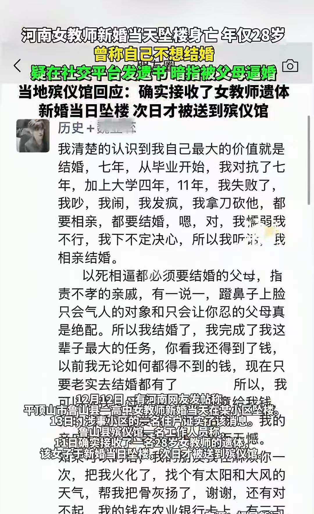 河南女教师新婚当天坠楼身亡,年仅28岁!生前朋友圈曝光:称自己不想结婚,被父母逼婚!网友:虽然死者为大!但结婚当天跳楼,你让男方咋想?定亲,看日子,结婚,又不是一天两天的事,为啥要选择当天…死都不怕,为什么不跑? 河南一处老旧小区里,本该张灯结彩的好日子,却被一场突如其来的悲剧蒙上了厚厚的阴影。12月10号上午九点多,刺耳的警笛声和救护车声划破了小区的宁静,打破了原本该有的喜庆氛围。住在同小区的街坊们,起初还以为是哪家闹家庭纠纷动了手,直到业主群里的消息炸开锅,大家才惊觉出事了,今天本该出嫁的新娘,从七楼跳了下来,28岁的年纪,就这么没了。 坠楼的姑娘是个“95后”高中历史老师,在学生眼里,她年轻漂亮,站上讲台总是带着温暖的笑容,讲课也特别有耐心,谁都没法把那个温润的老师,和倒在一楼院子里的冰凉躯体联系到一起。更让人揪心的是,事发后有人翻出她生前最后一条朋友圈,截图里的文字满是绝望,说自己根本不想结婚,却被父母逼着往前走,还无奈表示“我清楚地认识到,我自己最大的价值就是结婚”。 这条朋友圈一下就揭开了悲剧的根源,哪里是什么恐婚,分明是长期被至亲逼婚压得喘不过气。据她的朋友说,姑娘打心底里抗拒这门婚事,可父母根本不听她的想法,一门心思要按自己的意愿安排她的人生,定亲、看日子、筹备婚礼,一步步推进,没给她半点退缩的余地。谁也没想到,在婚礼当天这个本该最热闹的时刻,她会用这么决绝的方式,结束这场让她窒息的“安排”。 消息传到网上,瞬间引发了轩然大波,网友们吵得不可开交。有人心疼姑娘的遭遇,觉得她是被封建思想和父母的控制欲逼上了绝路,28岁正是大好年华,却因为一场不想要的婚姻丢了性命,实在太可惜。可也有不少网友提出了不同的看法,甚至带着几分不解和惋惜:“虽然死者为大,不该说重话,但结婚当天跳楼,你让男方家咋想?” 在这些网友看来,定亲、看日子、筹备婚礼,前后可不是一天两天的事,这么长的时间里,姑娘要是真的不想结婚,有无数次机会可以反抗或者逃跑,没必要等到结婚当天才做出这样极端的选择。还有人直言:“死都不怕,为什么不跑?换个城市重新开始,总比丢掉性命强啊。”这些疑问,戳中了很多人的痛点,也让大家对悲剧的发生多了几分复杂的情绪。 而小区里发生的后续事情,更让人心寒。姑娘坠楼的地方是一楼住户的院子,房主当场就被吓得不轻,反应过来后直接找到办喜事的女方家理论,说这房子以后根本没法住了,不仅要求赔偿,甚至放话说不想要这套房子了。好好的日子被搅乱,房主的委屈能理解,可看着一条鲜活的生命没了,最先想到的还是自己的房子和损失,难免让人觉得有些冷漠。 更让人唏嘘的是女方家和男方家的态度。一边是刚失去女儿的娘家,一边是原本要迎亲的婆家,本该互相慰藉的两家人,却忙着互相撇清干系。娘家人说,定亲、看日子的流程都走完了,姑娘已经算是“嫁出去的人”,不该再全算自家的事;男方家则觉得冤枉,人还没正式过门,是在娘家出的事,怎么也不该算到他们头上。两家人像踢皮球一样推来推去,全然忘了那个刚逝去的姑娘,生前是他们争相“安排”的对象,死后却成了谁都不愿接手的“烫手山芋”。 想想挺讽刺的,她还是个历史老师,或许曾在讲台上无数次跟学生讲过要剔除封建糟粕,要追求自由和独立,要做自己命运的主人。可现实却是,她教导别人要挣脱束缚,自己却被困在“到年龄必须结婚”“父母之命不能违”的枷锁里,最终没能走出来。这种理智上的清醒和行动上的无力,成了最戳人的撕裂感。 有人说,都什么年代了,怎么还会有这种逼婚致死的事?可只有真正经历过的人才知道,在一些看不见的角落,“女人的价值就是结婚生子”“不结婚就是不孝”的想法依然根深蒂固。那些打着“为你好”旗号的逼迫,看似是爱,实则是一把把软刀子,慢慢割掉了一个人的求生欲。或许在网友眼里,逃跑、反抗都是可行的办法,但对于长期被精神压迫、早已失去反抗勇气的她来说,逃离需要的不仅仅是胆量,更是她从未拥有过的底气。 最终警车和救护车来了又走,还是没能挽回她的生命。小区的水泥地上,除了留下一片让人叹息的痕迹,更留下了一个永远定格在28岁的年轻背影。这起悲剧也给很多人提了个醒,婚姻从来不是衡量一个人价值的唯一标准,父母所谓的“为你好”,也不该成为剥夺孩子选择权的借口。而那些质疑“为什么不跑”的人,或许也该明白,未经他人苦,莫劝他人善,不是所有人都有勇气挣脱束缚,也不是所有困境都能轻易逃离。 这事儿过后,小区里的喜庆氛围彻底没了,邻里们提起都忍不住叹气。一个鲜活的生命就这么没了,留下的不仅是两家人的矛盾,更是对所有人的拷问:到底该怎么平衡父母的期望和自己的人生?那些看似传统的观念,到底还要逼死多少人?希望这起悲剧能让更多人醒悟,尊重每个人的选择,别再用“爱”的名义,上演这样的悲剧。