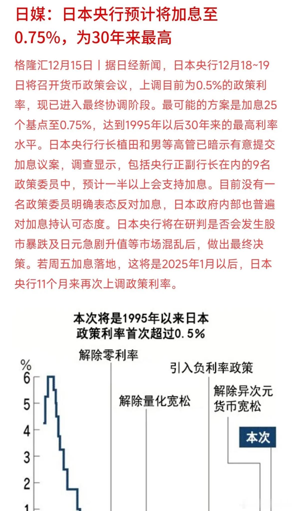 A股今日大跌,午后一路走低,核心原因是市场预期日本央行将大幅加息,可能达到三十年以来最高利率。市场担心资本会被日本吸引,日元升值对全球资本流动也会带来压力。对A股来说,虽然现在看不到北向资金实时动向,但日本加息大概率会分流部分外资流向日本,短期对A股的影响还是比较明显的,相当于外资短期回流日本带来的波动,力度虽不如美元相关调整,但短期冲击不容忽视。