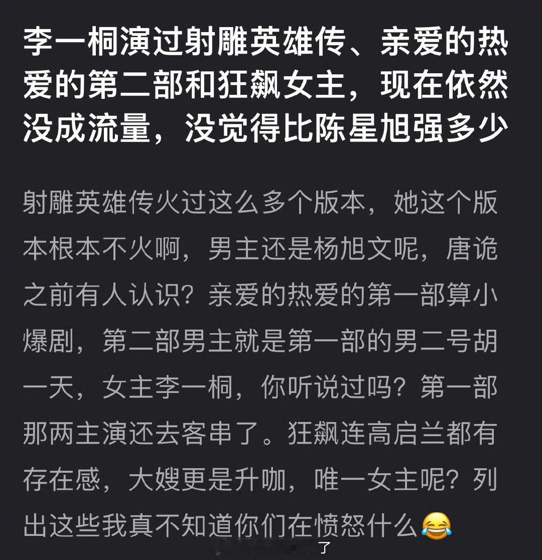 有网友说李一桐演过射雕英雄传、亲爱的热爱的第二部和狂飙女主……现在依然没成流量,没觉得比陈星旭强多少!为啥也是混到了被打成古偶丑男永拒的地步了? 金枝,网传李一桐陈星旭新剧平番