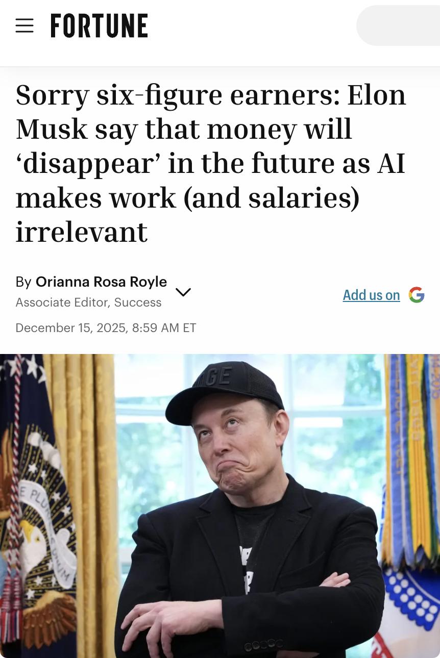 外媒:马斯克认为,在人工智能和机器人主导的未来劳动力市场中,薪水将不复存在,金钱也会随之变得无关紧要。 他以《文明》系列小说为例,描绘了一个人们可以免费获得一切的乌托邦未来,金钱将被废弃。马斯克预测,未来10到20年内,工作可能会变得可有可无。但这一转变也带来了问题,比如稀缺资源的分配。 专家认为,政府需要通过政策干预,比如推行全民基本收入,来应对这一变化,否则可能导致财富集中在少数人手中,社会出现经济灾难。